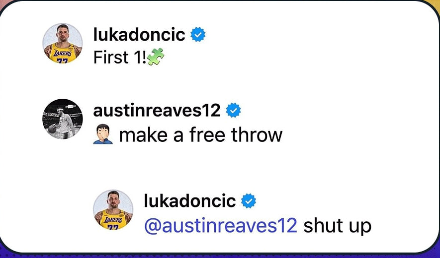 В матче с «Шарлотт» Лука и Ривз оба забили со своей половины после свистка. Разумеется, Дончич сразу указал одноклубнику, что он попал с более дальнего расстояния.