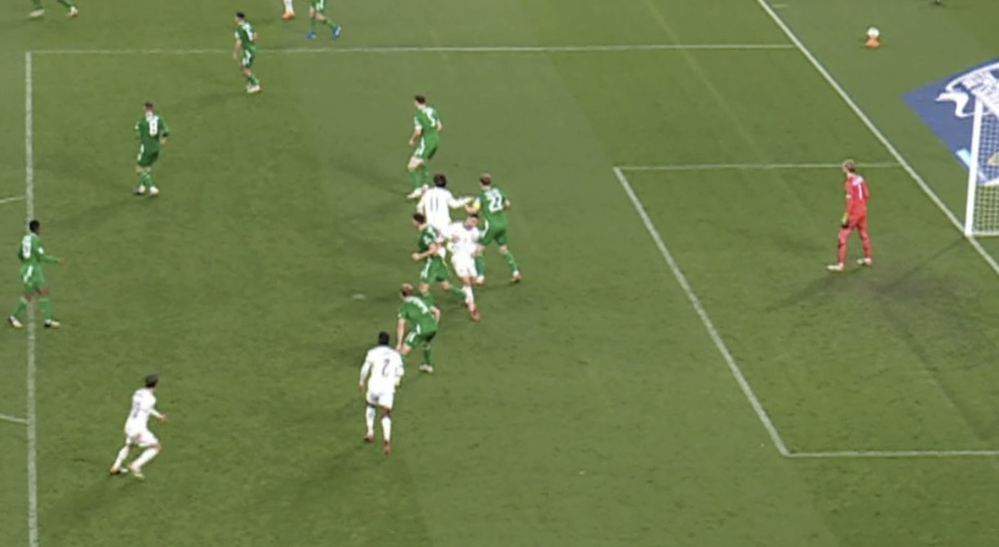 В центре штрафной, в борьбе – выглядит так, что просто вспылил. Возможно, в ответ на что-то ударил Дару О’Ши.