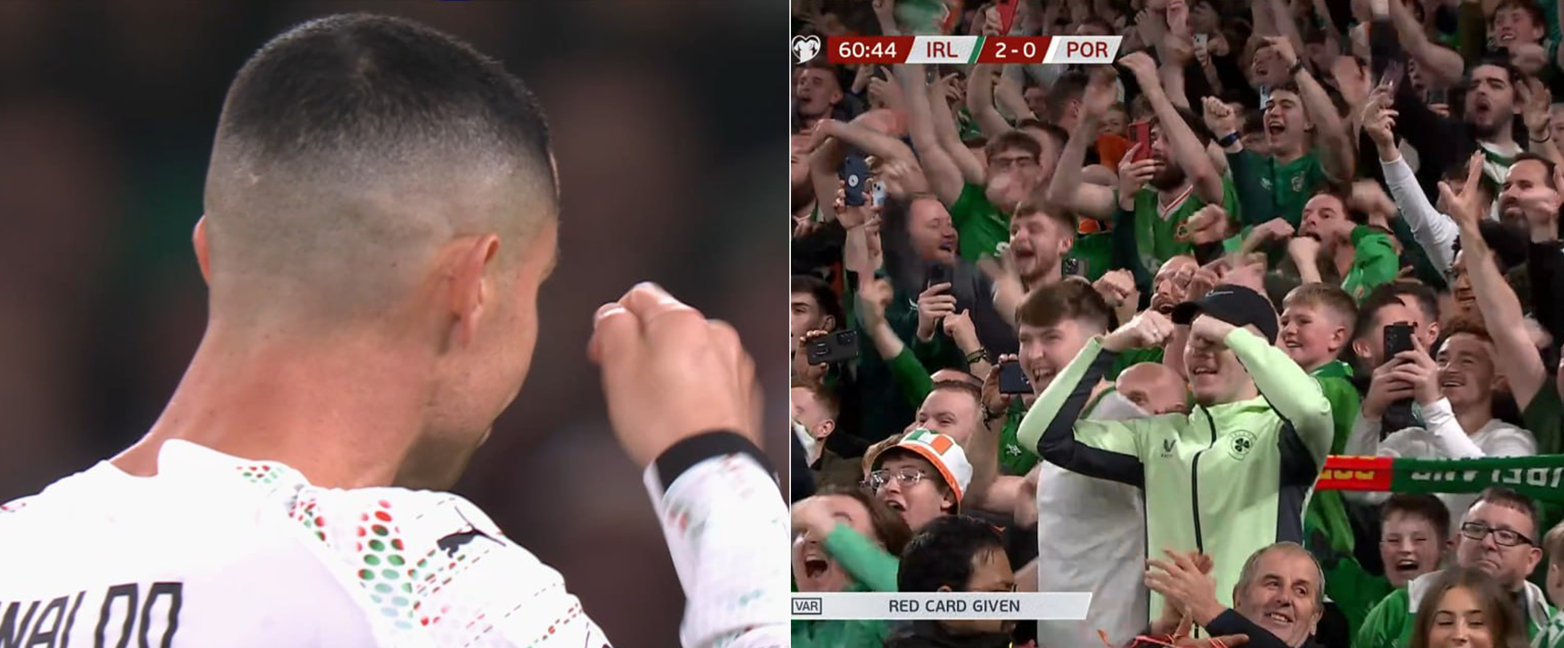 Потому что оттуда, конечно, троллили. Роналду еще до того показал кому-то такие «плаки-плаки» – возможно, что ирландской скамейке. Это было еще до вмешательства ВАР, когда он думал, что получил только желтую. Она превратилась в красную – и фанаты пошли издеваться.