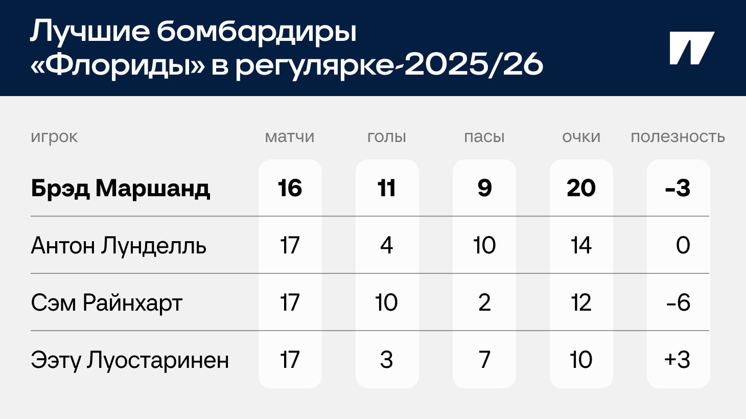 В топ-5, разумеется, есть и его партнеры по звену: Лунделль набрал 14 очков, а Луостаринен – 10. А вот самый ценный игрок плей-офф, Сэм Беннетт, начал сезон совсем неудачно – 3+2 за 17 матчей. Поэтому такой перформанс Маршанда максимально важен сейчас для команды.