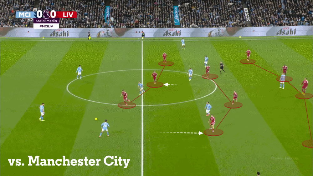 Пример этого показан ниже во время поражения «Ливерпуля» от «Сити». В данном случае Мак Аллистер отходит назад, Гравенберх выходит вперед, а Вирц сместился влево, чтобы сохранить численный состав в центральных зонах.