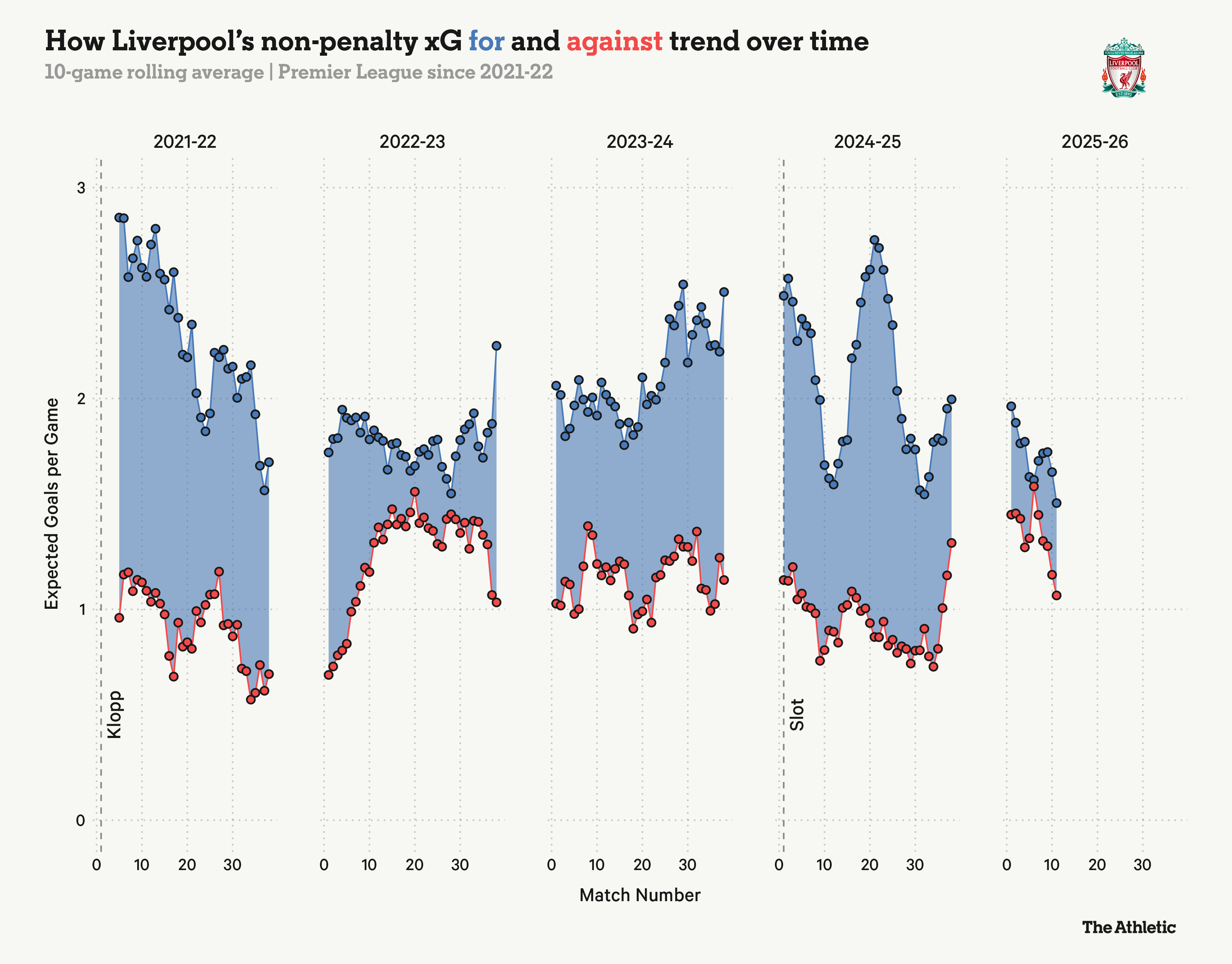 Слот уже не в первый раз говорит о создании моментов, и он действительно прав. В 11 матчах Премьер-лиги у «Ливерпуля» в среднем 1,5 ожидаемых гола за 90 минут без учета пенальти. На первый взгляд, это много, но это меньше, чем в прошлом сезоне, когда они в среднем забивали по два гола за игру, и вызывает беспокойство, когда количество упущенных моментов увеличивается, как показано ниже.