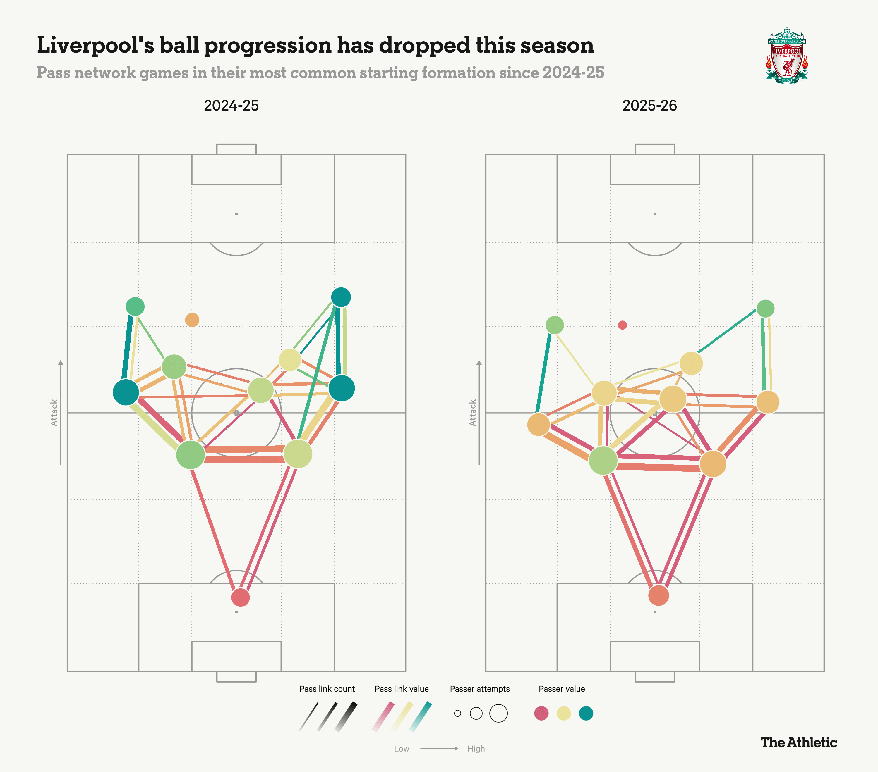 Из-за снижения темпов прогрессии в этих областях больше внимания уделяется полузащите. В настоящее время Джонс отдает больше всего прогрессивных передач за 90 минут (12,6 — по сравнению с 6,2), хотя это показатель небольшой выборки. Производительность Собослаи увеличилась (с 4,7 в 2024-25 годах до 7,8), а Вирц добавил 6,2 за 90 минут, но у Мак Аллистера показатель снизился с 6,1 до 3,7.