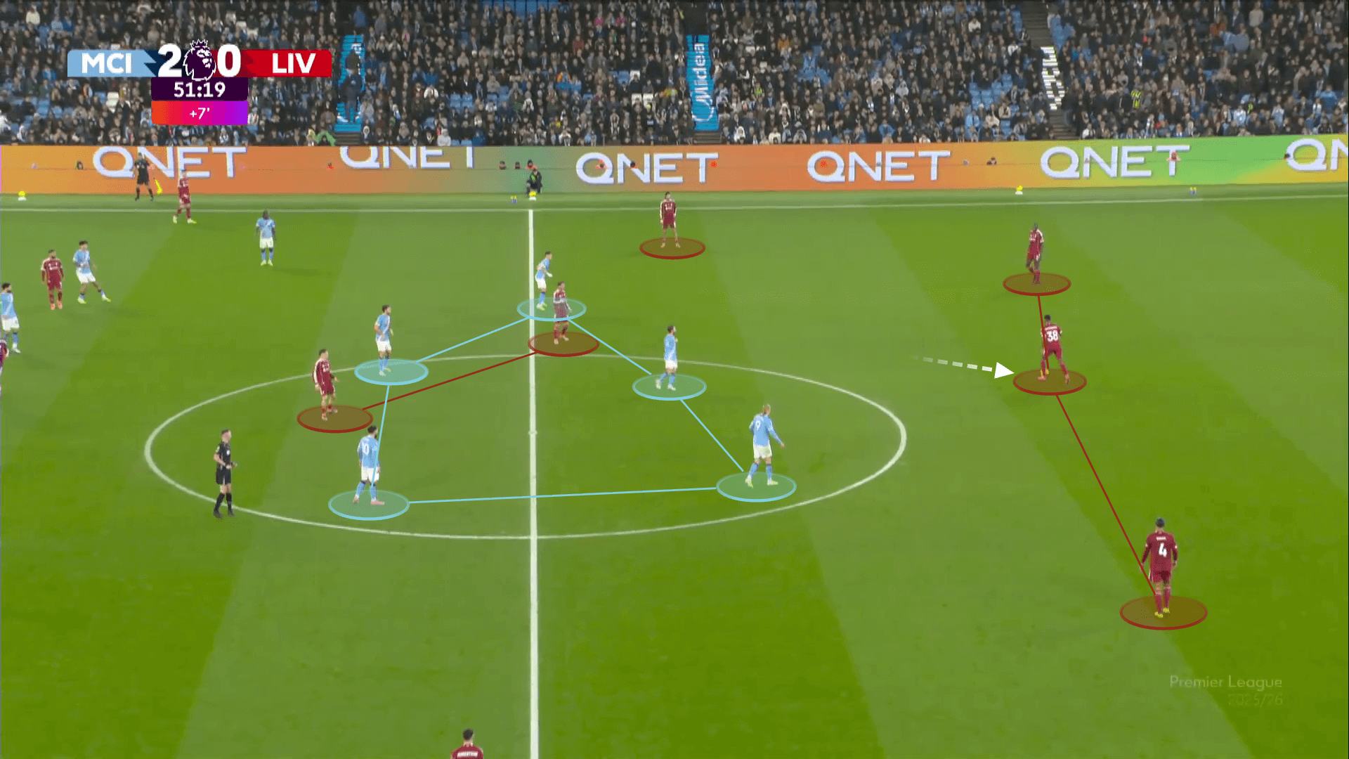 Когда «Ливерпуль» сильно прессингует, он не проявляет того энтузиазма, который был в предыдущих сезонах. Чтобы убедиться в этом, достаточно посмотреть на первый гол «Сити». В несколько прыжков «Сити» отправил мяч от собственного углового флажка в сетку ворот вратаря Георгия Мамардашвили, не встретив ни малейшего сопротивления.