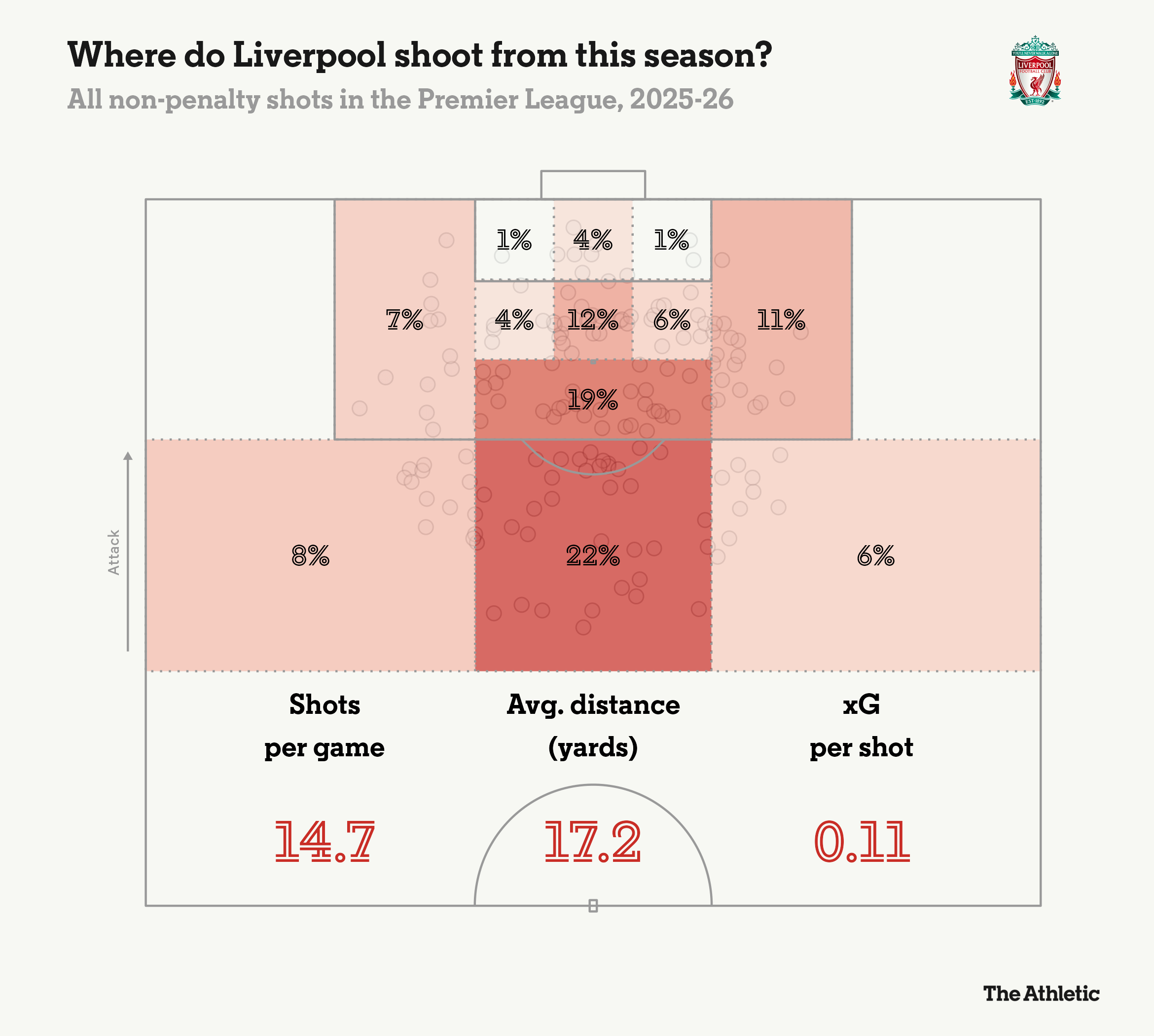 Это указывает на отсутствие четких завершений, но, как видно из приведенной ниже карты ударов, места для этих ударов стали менее оптимальными. В прошлом сезоне средняя дальность удара «Ливерпуля» составляла 13,62 метра, тогда как в этом сезоне она увеличилась до 15,73 метра. Меньшее количество ударов более низкого среднего качества не создает угрожающей комбинации.