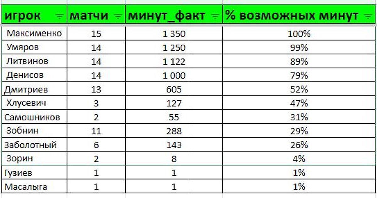 Вашему вниманию предлагается срез статистики по проценту возможных сыгранных минут (сыгранные минут / возможные сыгранные минуты) российских игроков ФК Спартак Москва после первого круга МИР РПЛ сезона 2025/26.