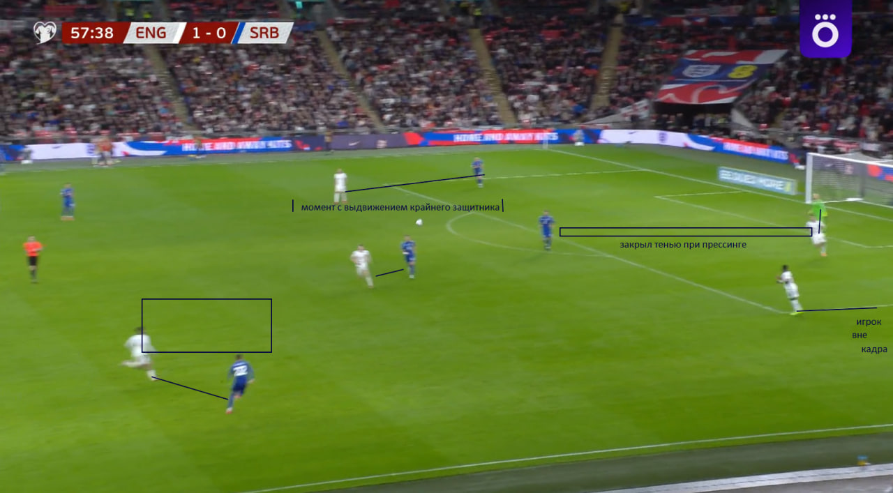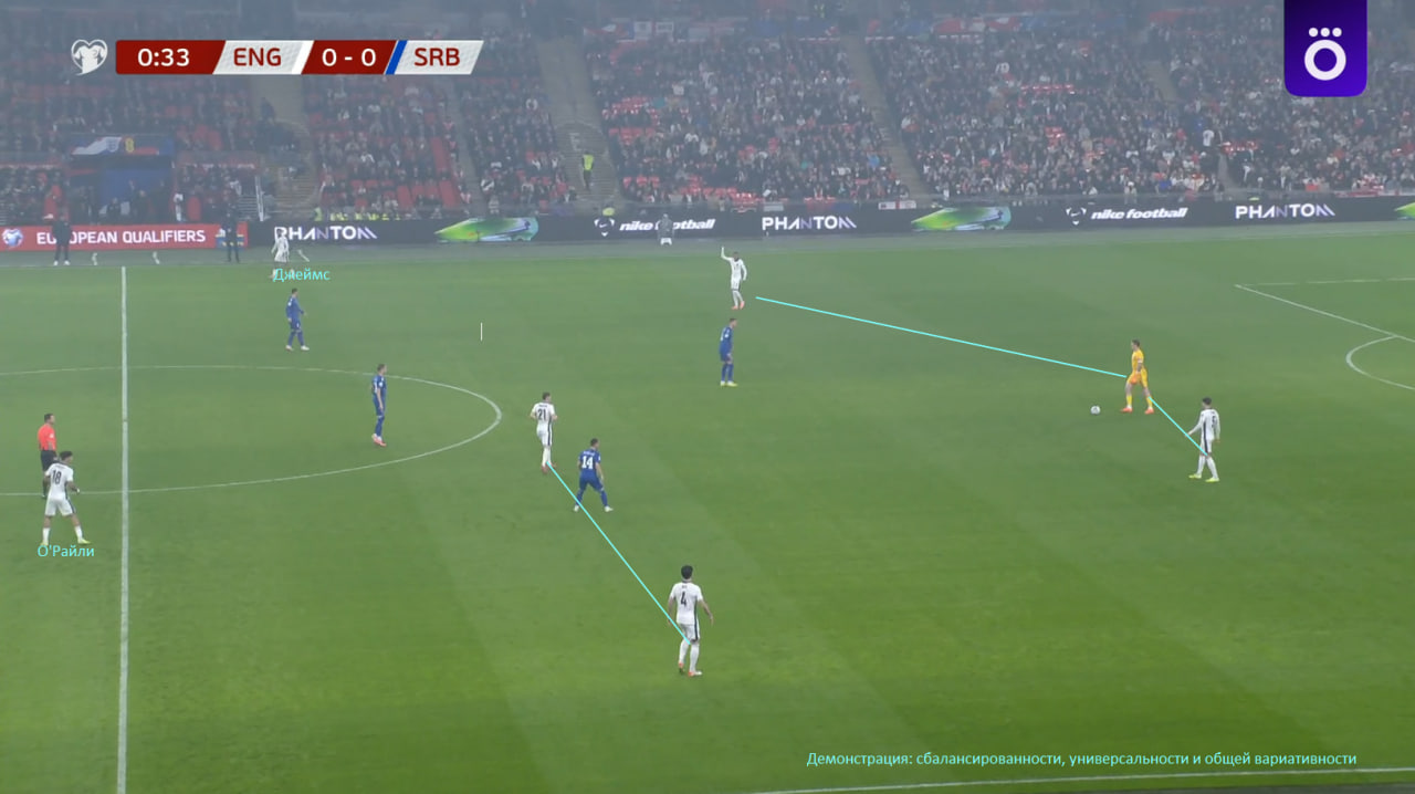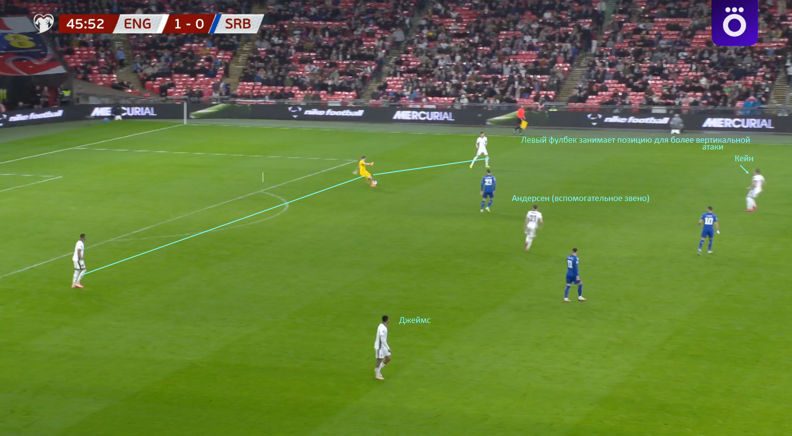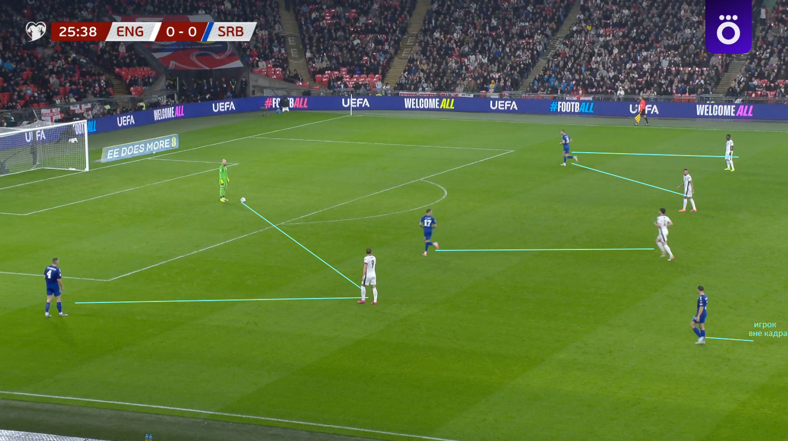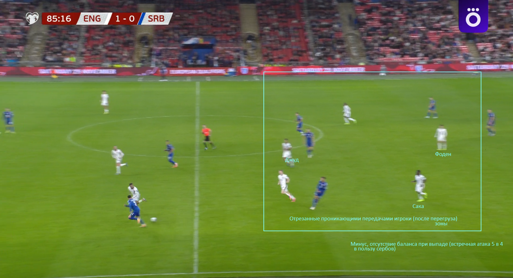 Снова стоит сказать, что проверять данное надо в дальнейшем (на стадии формирования рабочая вариация), ведь прессинг со стороны сербов не выглядел отточенным, что при темповых ошибках давало англичанам возможности продвижения (во время использования уязвимостей, либо же при спуске структуры соперника.