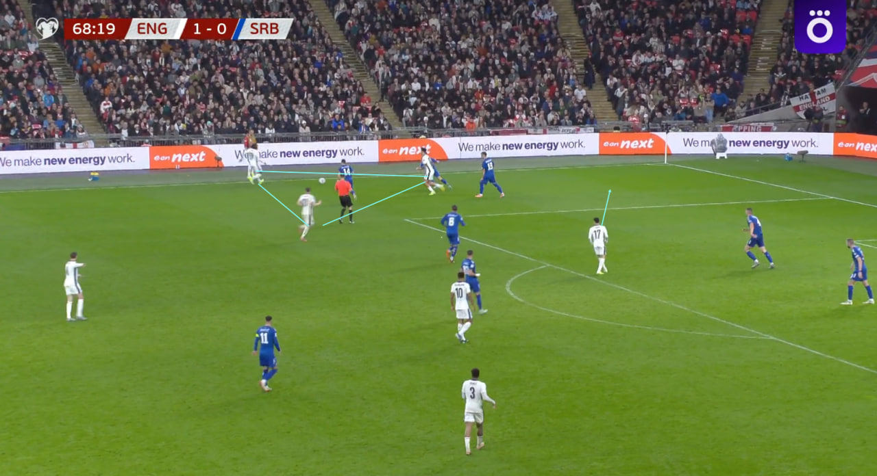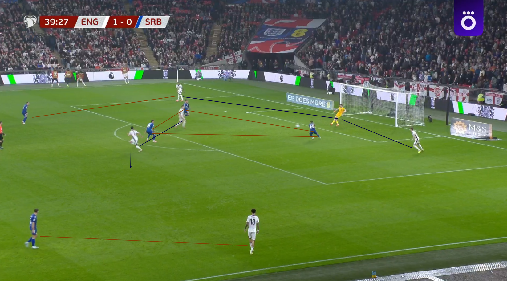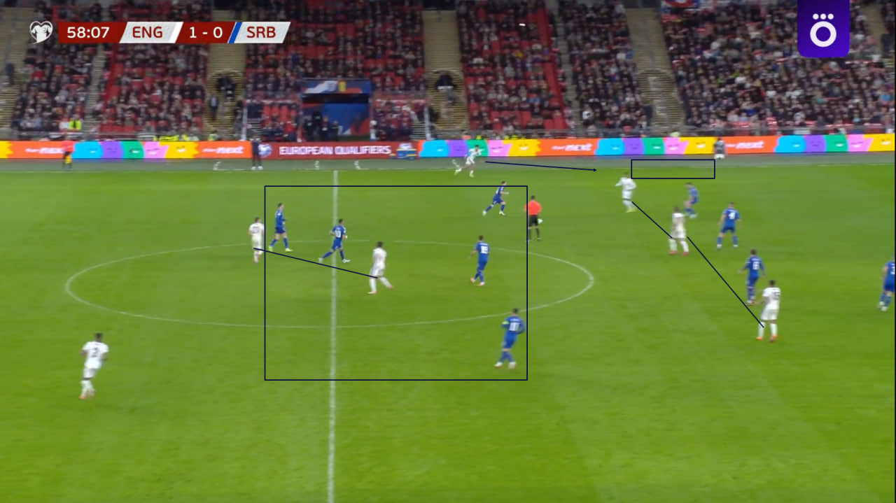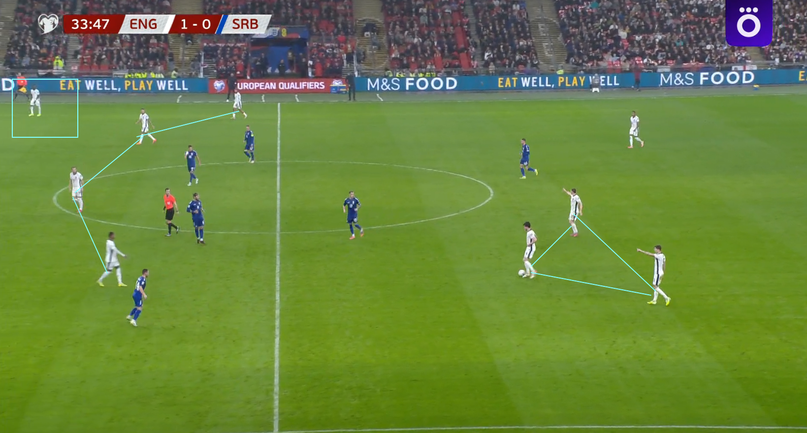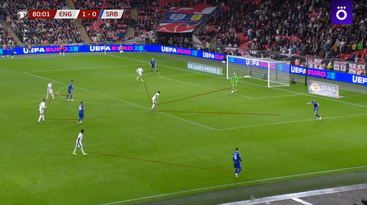 Снова стоит сказать, что проверять данное надо в дальнейшем (на стадии формирования рабочая вариация), ведь прессинг со стороны сербов не выглядел отточенным, что при темповых ошибках давало англичанам возможности продвижения (во время использования уязвимостей, либо же при спуске структуры соперника.