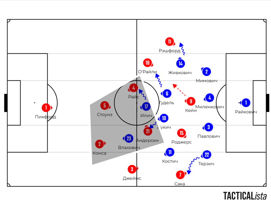 Самая же основополагающая и интересная структура в центре поля: связка Райса и Андерсена способна давать универсальность вариации, выступая исходя из возможностей, взаимодействуя с взаимозаменяемостью. Ситуативные спуски (одного или сразу двух игроков), расположение на различной вышине с созданием пространства для друг друга, постоянное поддержание тонуса и сканирование пространства различной ширины, и всё это в связке, то есть с важной ролью каждого человека.
