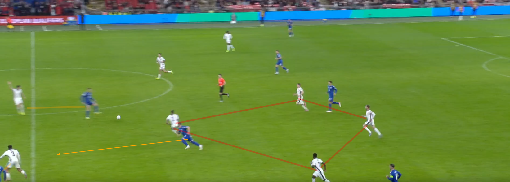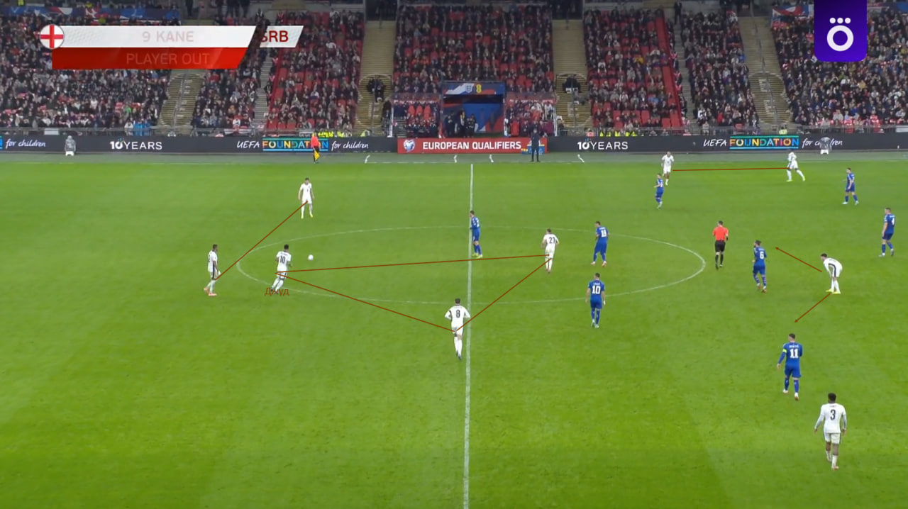 Интенсивность и гибкость основополагающего инструмента — билд-апа со стороны англичан, ранее менялась в зависимости именно от актуальности формы игроков (при постройках), сейчас же, при большей структурности, стало больше и вариативности, вариация стала более сбалансированной: при заточенности на сохранение мяча, производится постоянный поиск более вертикальных вариантов.