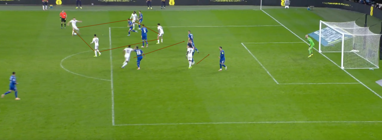 Разбирая вариацию, прежде всего хочется подчеркнуть, что при розыгрыше происходит зависимость от каждого звена, разыгрывающие защитники взаимодействуют с пространством и определяют темп, в центре поля создают общие вариации своими открываниями (освобождая или атакуя (как Райс фирменным образом) пространства и взаимодействуя с таймингами в соотношении).
