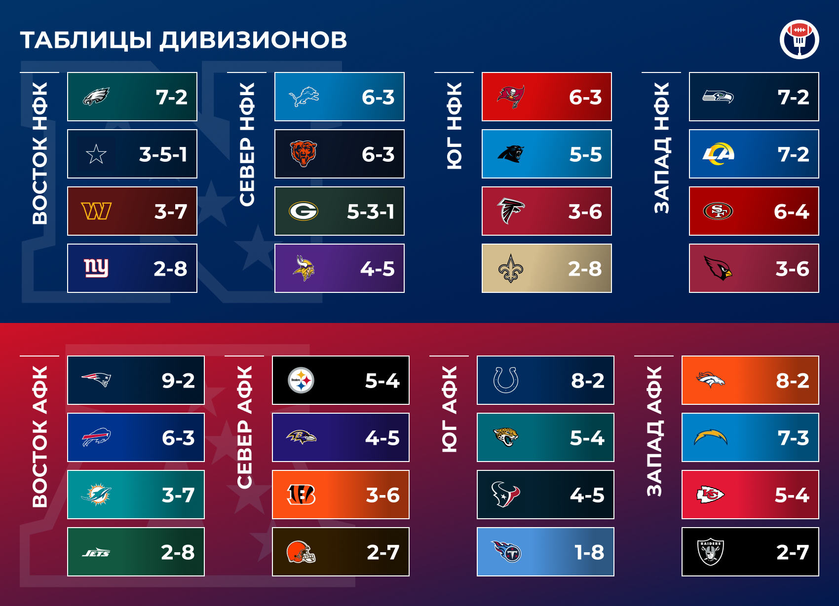 Для «Биллс» поражение страшнее. Во-первых, «Пэтриотс» в том же дивизионе оторвались уже на три победы. Во-вторых, в АФК целых три команды с 8+ побед, в НФК нет ни одной. Но и «Тампе» без высокого посева по итогам регулярки вряд ли многое в плей-офф светит.