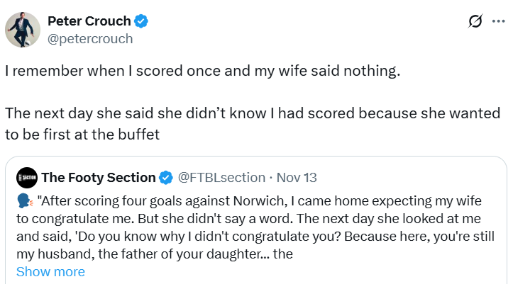 Философское размышление Суареса украсил Питер Крауч. Англичанин репостнул пост с историей Луиса, добавив шутку о своей супруге: