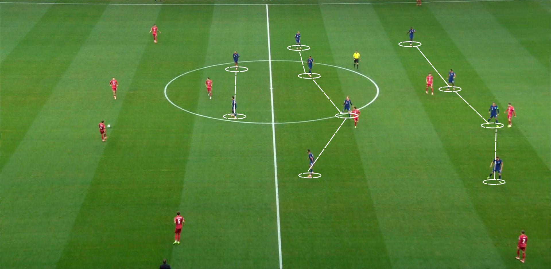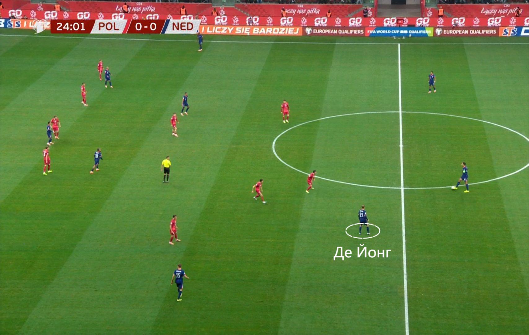 Голландия же катала мяч большую половину времени. 38% на 62% по владению на 35-й минуте матча. Жаль, что к голу это не привело. Зато так же, как соперник, Голландия отлично работала без мяча. Схема 4-2-1-3 постепенно переходила в 4-4-2 и обратно, Клюйверт и Депай часто бегали в прессинг, а Ван Дейк весь матч кошмарил бедного Левандовски, то и дело оказываясь у него за спиной.