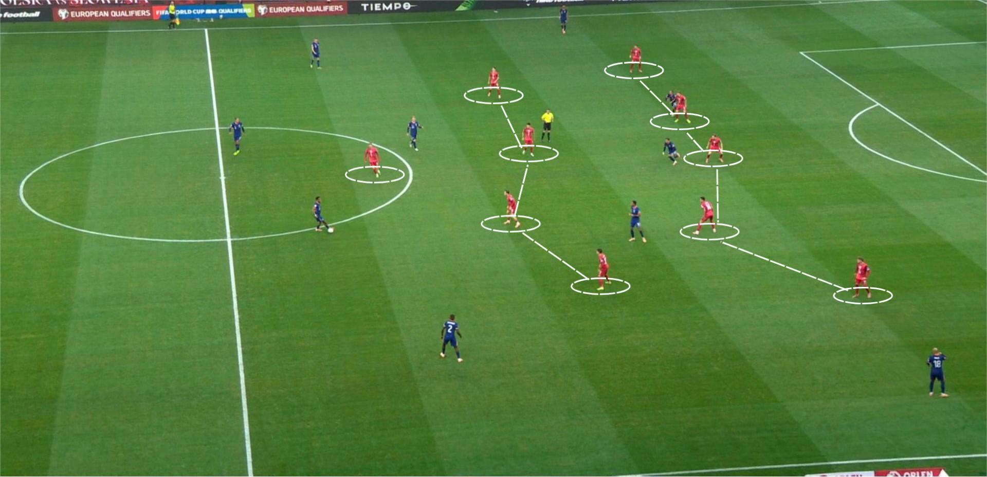 Ян Урбан не менял схему по сравнению с матчем месячной давности, также выставил 3-х центральных защитников. Изменилось лишь наполнение состава, по сравнению с тем же матчем на поле появились 4 новых игрока. Расстановка Польши была такова: