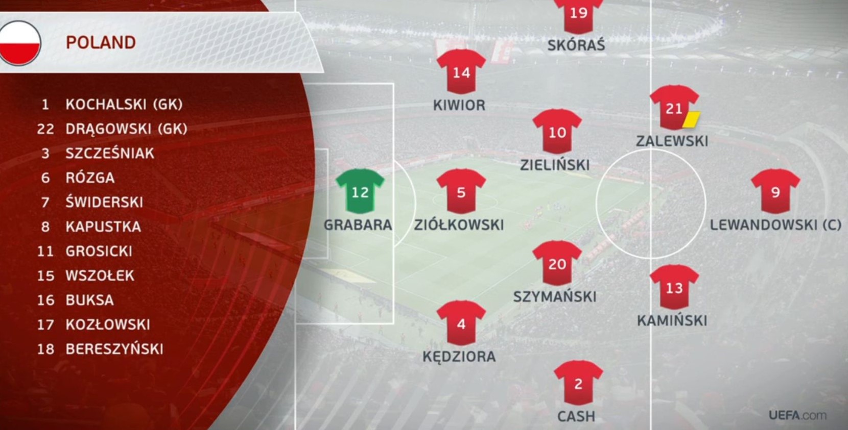 Замены: Польша: 13` Б. Капустка (С. Шиманский), 81` П. Вшолек (М. Кэш), 81` К. Гросицкий (В. Залевски), 90+2` А. Букса (Р. Левандовски), 90+2` Ф. Розга (Я. Каминьский).