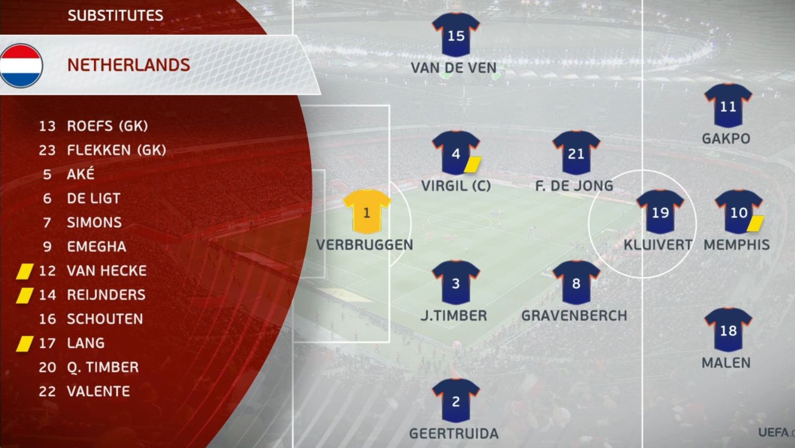А Рональд Куман решил не экспериментировать с составом, выпустил тот же, что был месяц назад, но за исключением правого защитника - вместо Думфриса вышел Лутсхарел Гертрюйда (неплохое упражнение на дикцию).