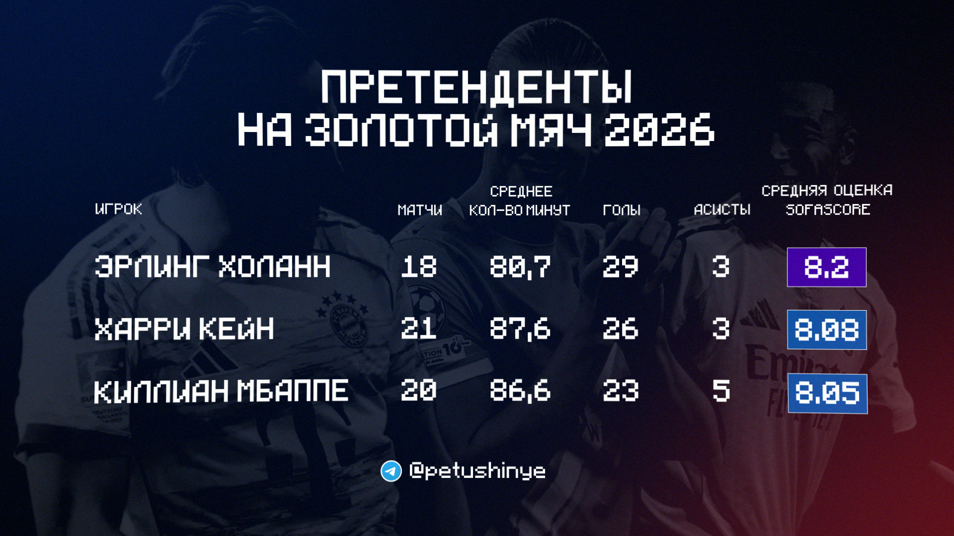 В этом году заруба за «Золотой мяч» будет как никогда серьёзной! Помимо Кейна, на главную индивидуальную награду претендуют Мбаппе и Холанн — оба выдают сумасшедшие сезоны с какими-то недосягаемыми для простых смертных цифрами.