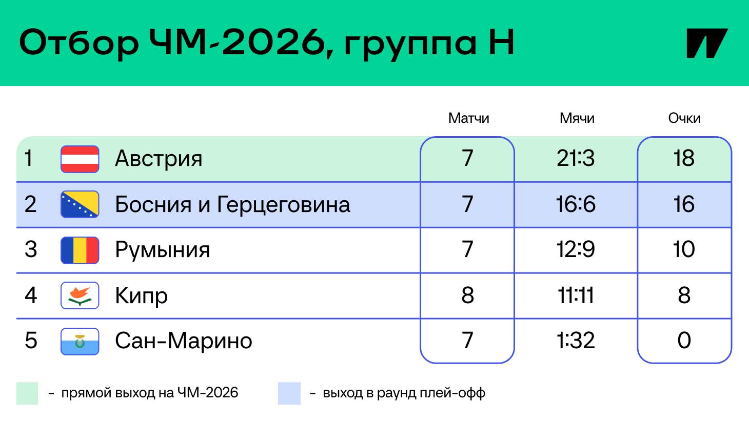Босния дожала: по голу у форвардов Эсмира Байрактаревича и Хариса Табаковича – важнейшие мячи, ведь гарантировали боснийцам минимум стыки. И даже есть шансы зацепиться за прямой выход.