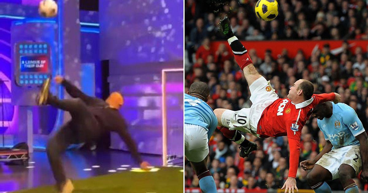 С того матча прошло почти 15 лет, на юмористическом шоу A League of Their Own Руни попросили повторить тот самый удар. Легенда не подвел!
