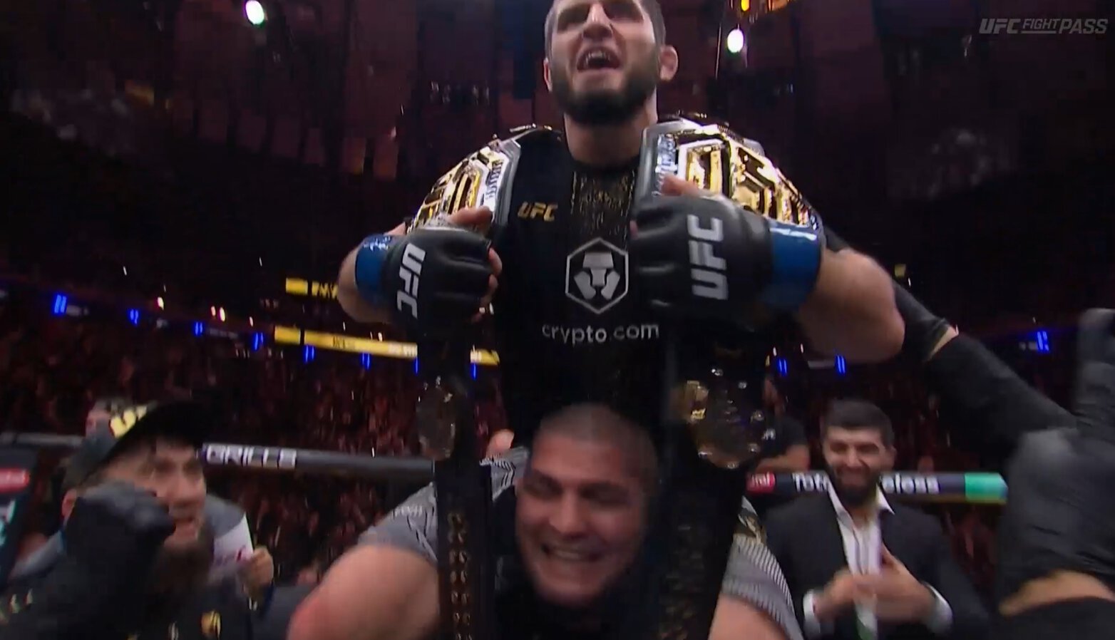 Хабиб повесил на Ислама титулы и поднял его на плечи, прокатив по октагону: