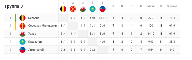 Бельгийцы вчерашней ничьей в Казахстане устроили себе, на первый взгляд, нервную концовку отборочного этапа ЧМ-2026, но по факту они просто отсрочили праздник на несколько дней. Дело в том, что в последнем матче группы бельгийцы примут Лихтенштейн, который еще даже не начинал забивать в этом турнире. Хозяевам будет достаточно не проиграть из-за отличной разницы забитых и пропущенных мячей (+15). А за второе место поборются тет-а-тет Северная Македония и Уэльс. Валлийцы примут гостей с Балканского полуострова в Кардифе и им нужна только победа, в противном случае македонцы при других исходах станут вторыми и примут участие в турнире стыковых матчей.