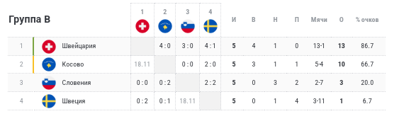 В последнем туре Косово примет Швейцарию. Косовары отстают от лидирующих гостей на 3 очка и на 9 голов разницы забитых и пропущенных мячей. Шансы на первенство балканцы, безусловно, сохраняют, но только математические – Косово нужна победа в 5 мячей.