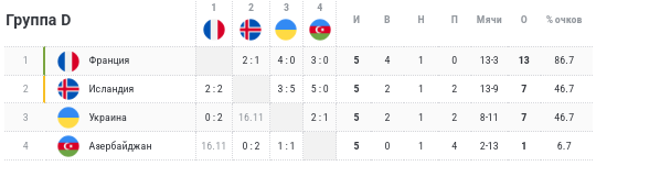 Франция уже обеспечила себе первое место, а Украина и Исландия проведут очную ставку сегодня. Исландцам достаточно сыграть вничью благодаря лучшей разнице забитых и пропущенных мячей, “жовто-блакитным” нужна только победа для попадания в турнир стыковых матчей.