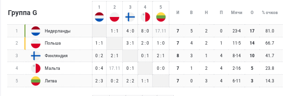 Здесь в гонке за 1 прямую путевку только 2 сборные: Нидерланды и Польша, где у голландцев есть преимущество в 3 очка. Им достаточно не проиграть дома Литве, и они гарантированно остаются первыми в группе. У поляков миссия практически невыполнима: надо обыграть Мальту на выезде с разницей в 13 мячей, при условии, что “оранжевые” минимально уступят дома прибалтийцам.