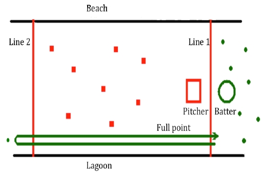 Поле для игры представляет собой прямоугольник. В его пределах находится команда защиты, а за одной из сторон — команда атаки. Один из защитников подбрасывает мяч бьющему из атаки, и если тот отбил, он может попробовать добежать до противоположной линии. И если он потом сможет вернуться — его команда получит очки. Часто после удара бьющие не начинают пробежку, а отходят в сторону и ждут подходящего момента, чтобы совершить групповую перебежку.