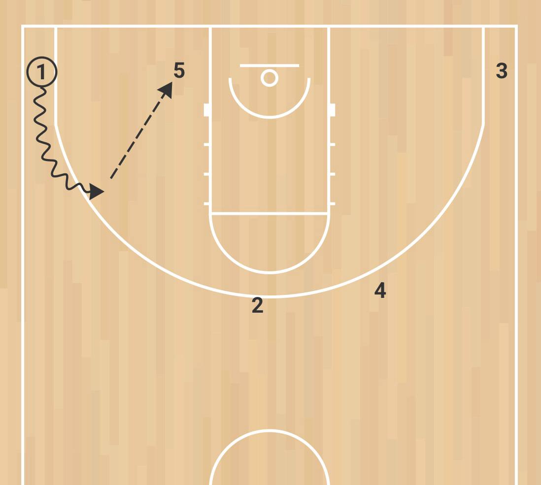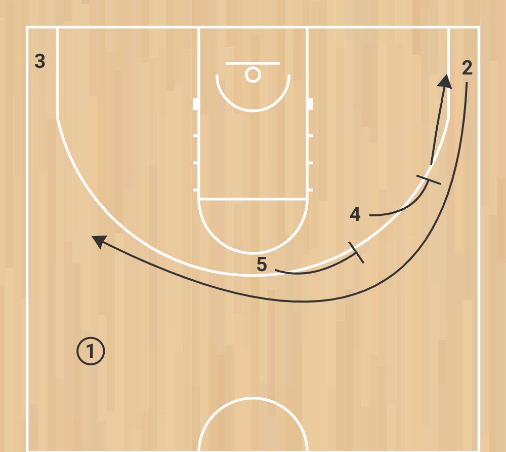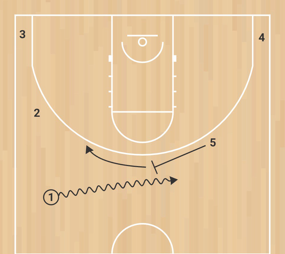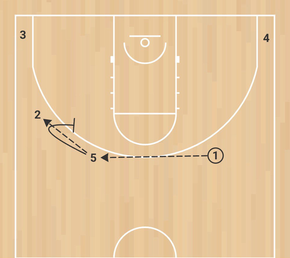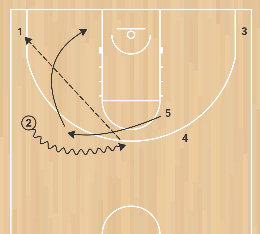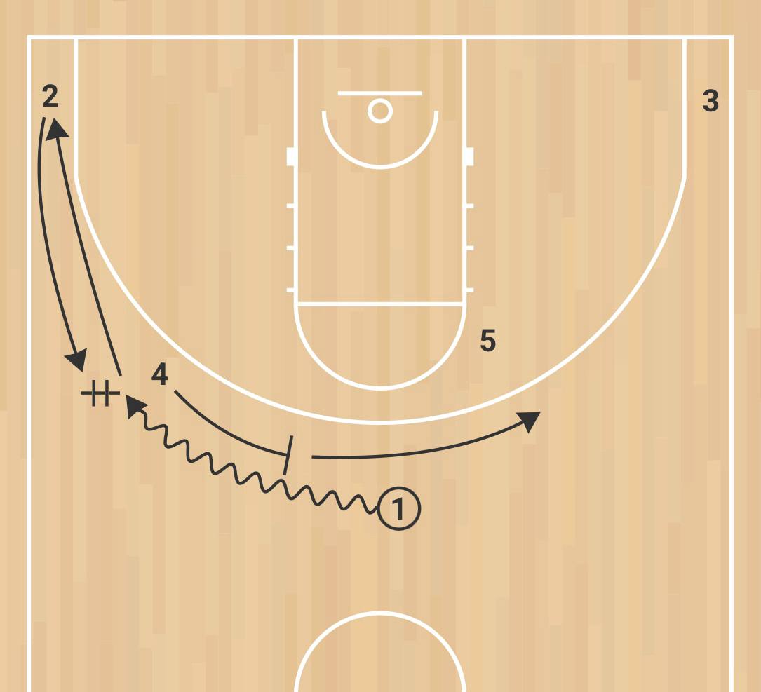 Вторая схема: игрок 1 получает заслон от игрока 4, а далее происходит Pistol action. Это взаимодействие трех игроков нападения — двух защитников (1 и 2) и большого (5), когда защитники играют друг с другом на краю dribble hand-off , после чего игрок с мячом (2) получает заслон от большого (5), который затем проваливается в dunker spot. В это время игрок 2 отдает передачу в угол игроку 1, а тот атакует close-out, после чего делает скидку игроку 5.