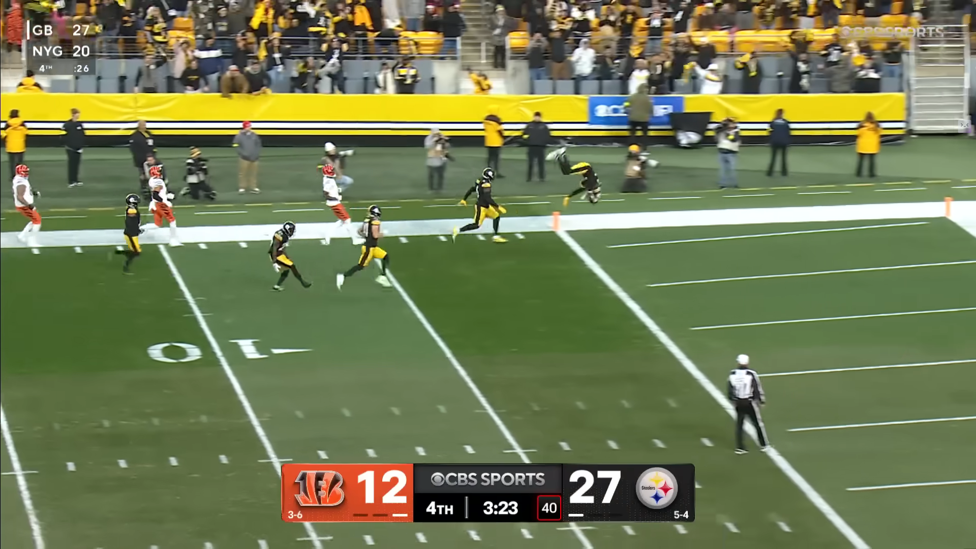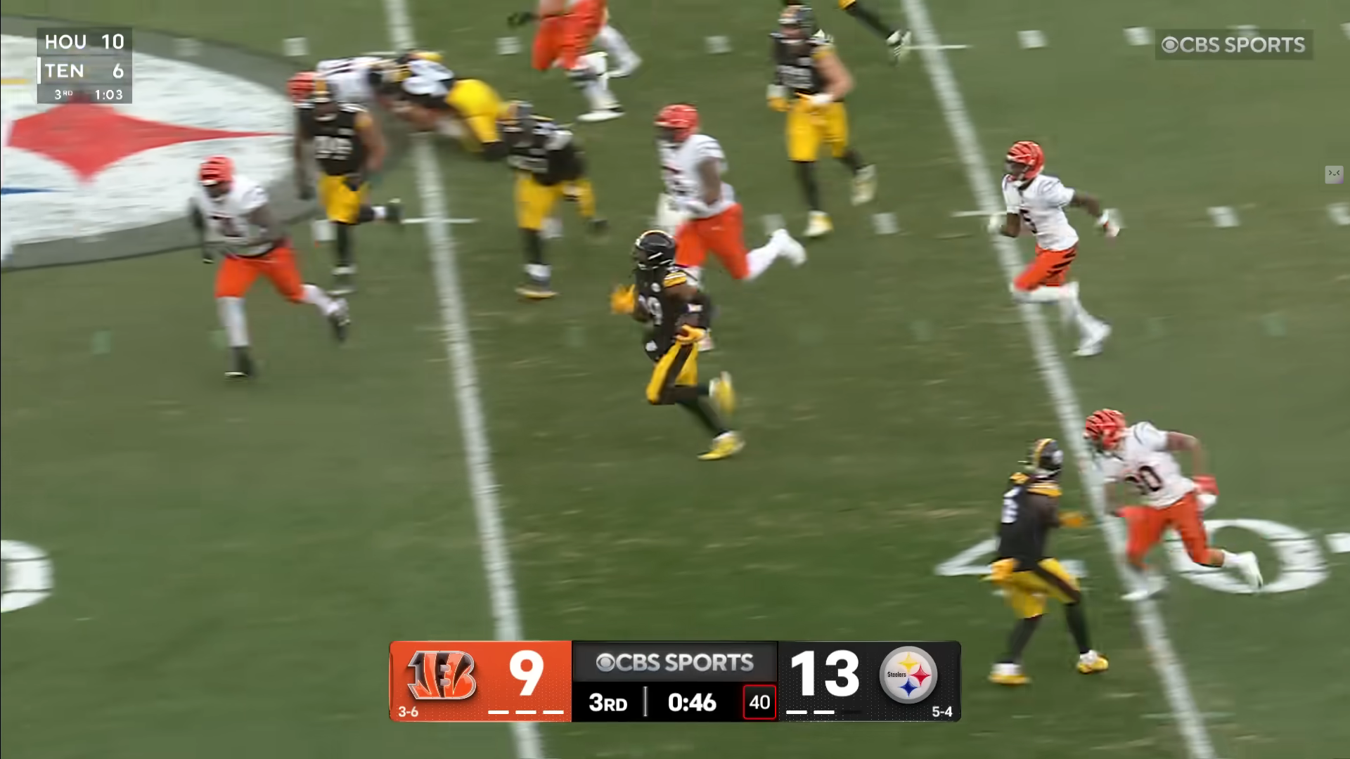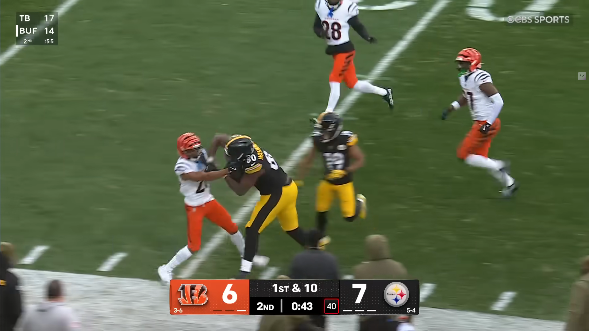 А другой бегущий, Джейлен Уоррен, перед этим совершил крутейший забег с мячом на 40 с лишним ярдов, оббежав по пути половину защиты «Цинци» и выдав пинка ДиДжею Тёрнеру. А вот не будет левые перехваты присваивать! Надо сказать, подействовали. Перехватов в этом матче, ни левых, ни правильных, защита «Цинциннати» не совершила.
