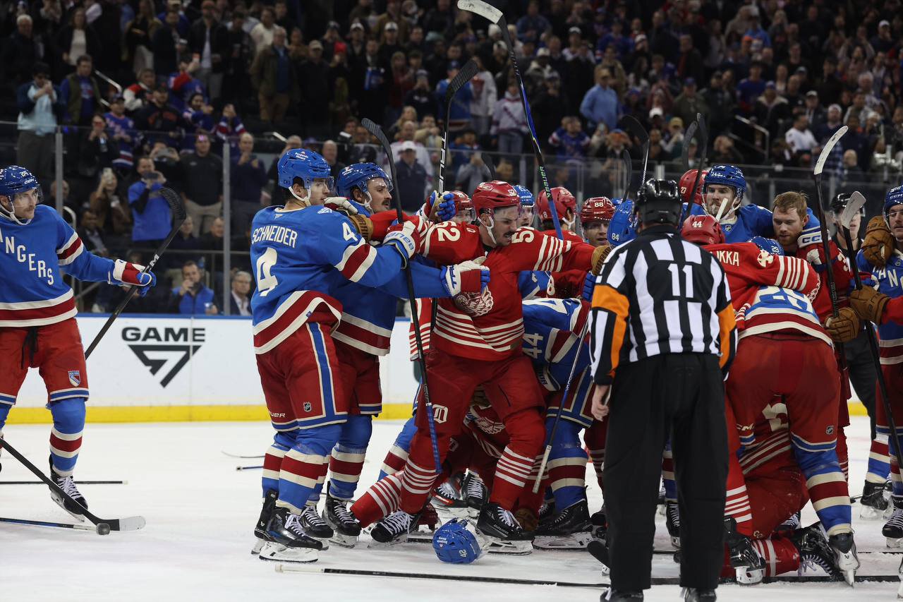 «Детройт» на выезде обыграл «Рейнджерс» (2:1), но кому какое дело до результата, если в конце случилась стычка в формате двадцать на двадцать.