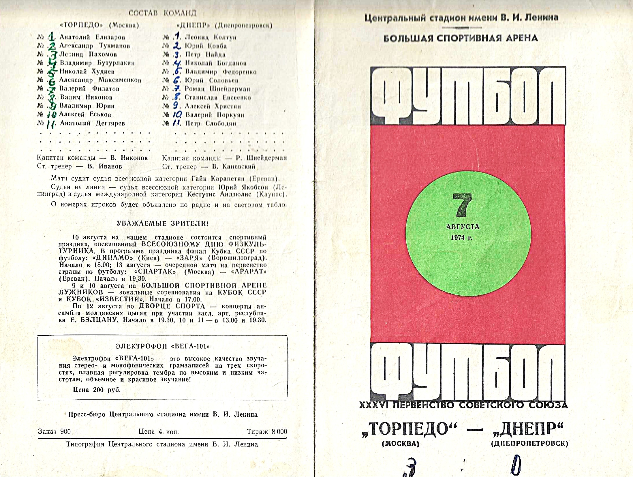 Торпедо (Москва) - Днепр (Днепропетровск). 7 августа 1974 года / Первенство Советского Союза