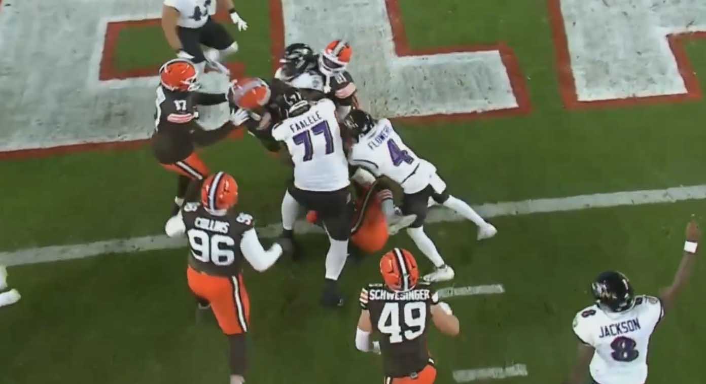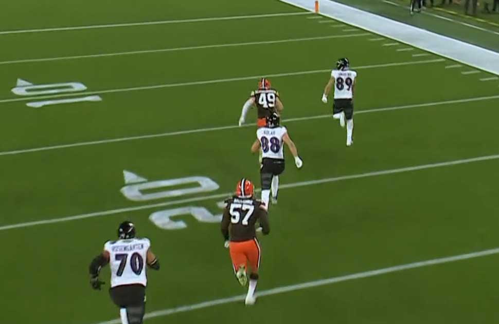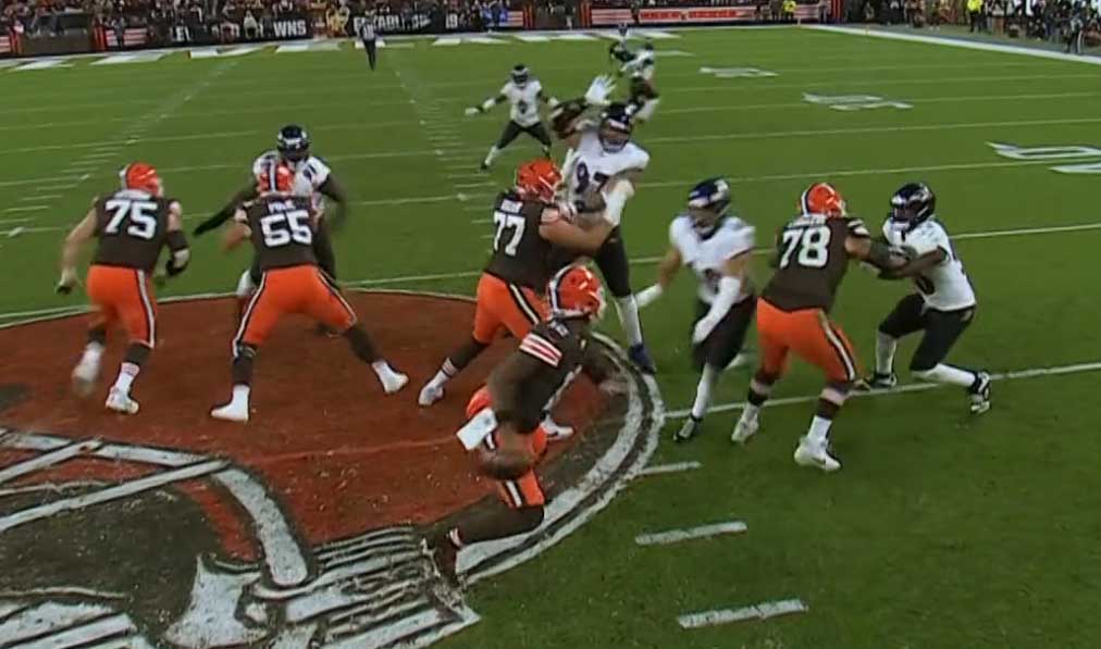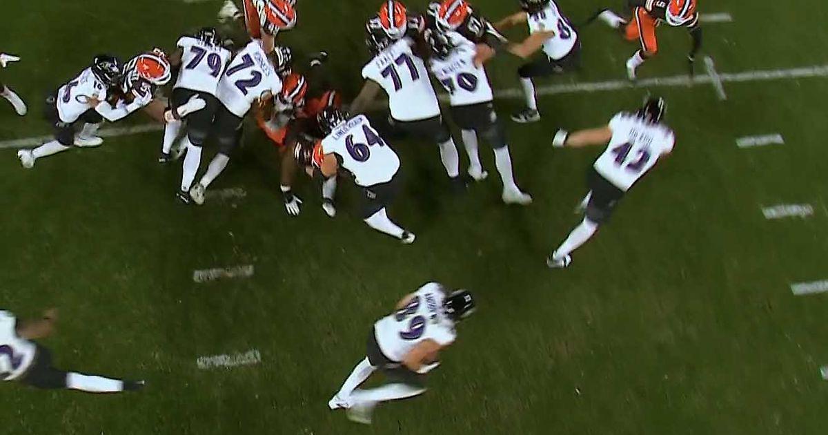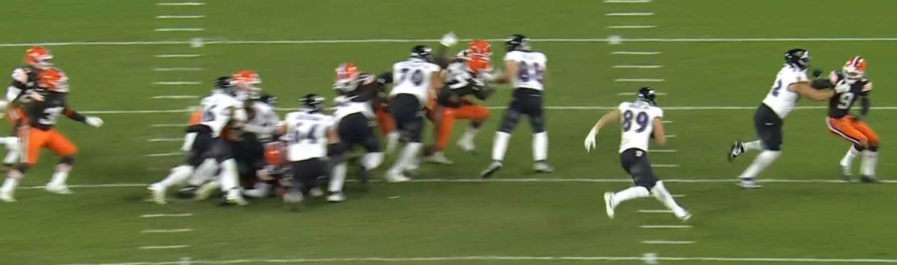 Даже Фаалеле повёрнут в нужную сторону. Уорд догнал и схватил за шнурки. 59 ярдов, 1&гол на 9 ярдах. Неужто и сейчас Ламар всё засрёт?