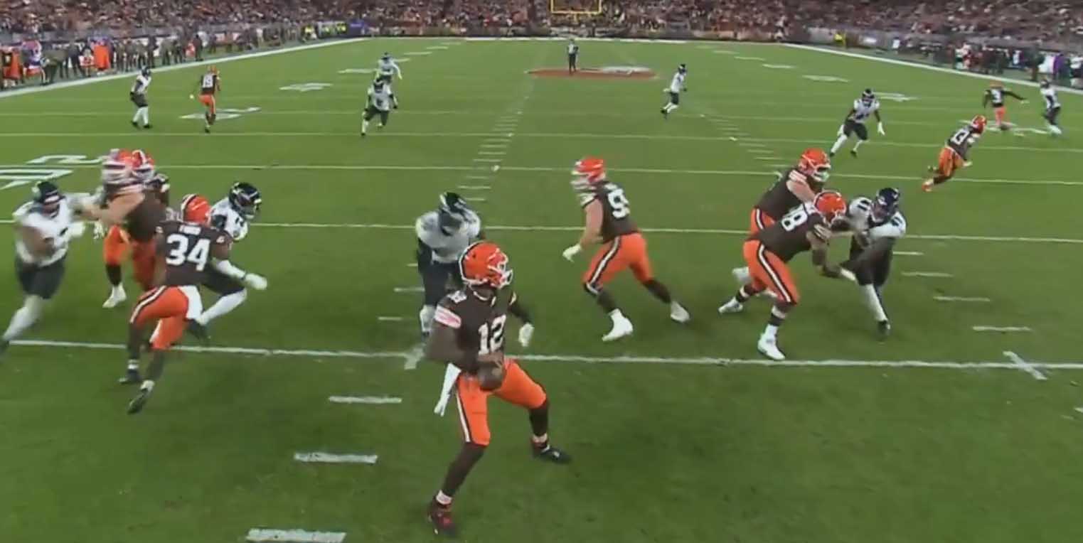 Шедур скрэмблит, 5 ярдов, Хэмилтон тэклит и повреждает плечо. Ещё не хватало Хэмилтона потерять из-за такой фигни, как выигранная концовка с Браунс.