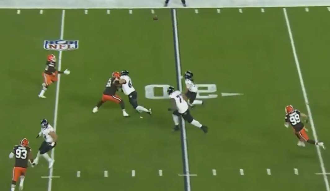 Ламар сначала застрял в конверте, потом выкатился вправо и бросил в зачётку на перехват в сторону Эндрюса.