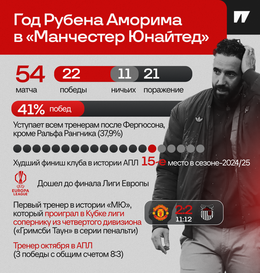 Сезон-2024/25 все равно не спасли: унизительное 15-е место и тактически бездарный финал Лиги Европы (0:1 от «Тоттенхэма»). Аморим все же получил полную поддержку руководства и летом избавился от неподходящих игроков. Позже признал, что поражения в том сезоне дали ему намного больше знаний, чем победы в «Спортинге».