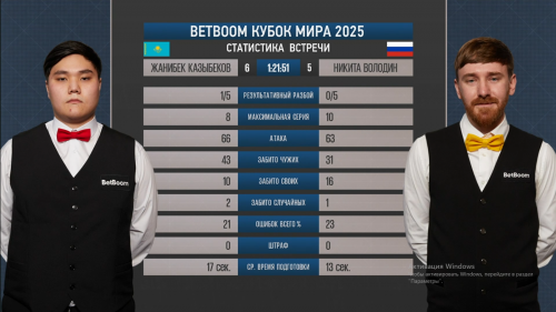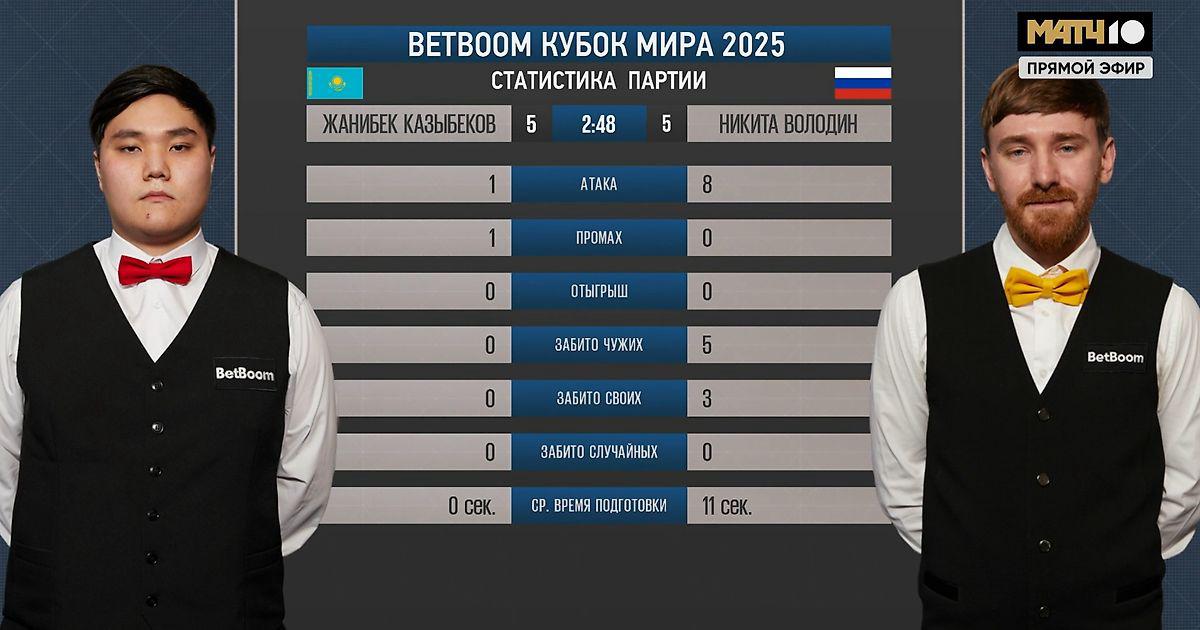 2:0, 2:4. Жанибек вел, потом Никита перехватывал инициативу. Но чувство надвигающейся жары Никиту Володина не подвело: спортсмены не могли выявить сильнейшего, сыграли 5:5. Как Жанибек вернулся с 2:4… Повел 5:4 за 3 минуты до конца встречи. И какой уровень уже Никита на фоне стресса продемонстрировал в десятой партии!