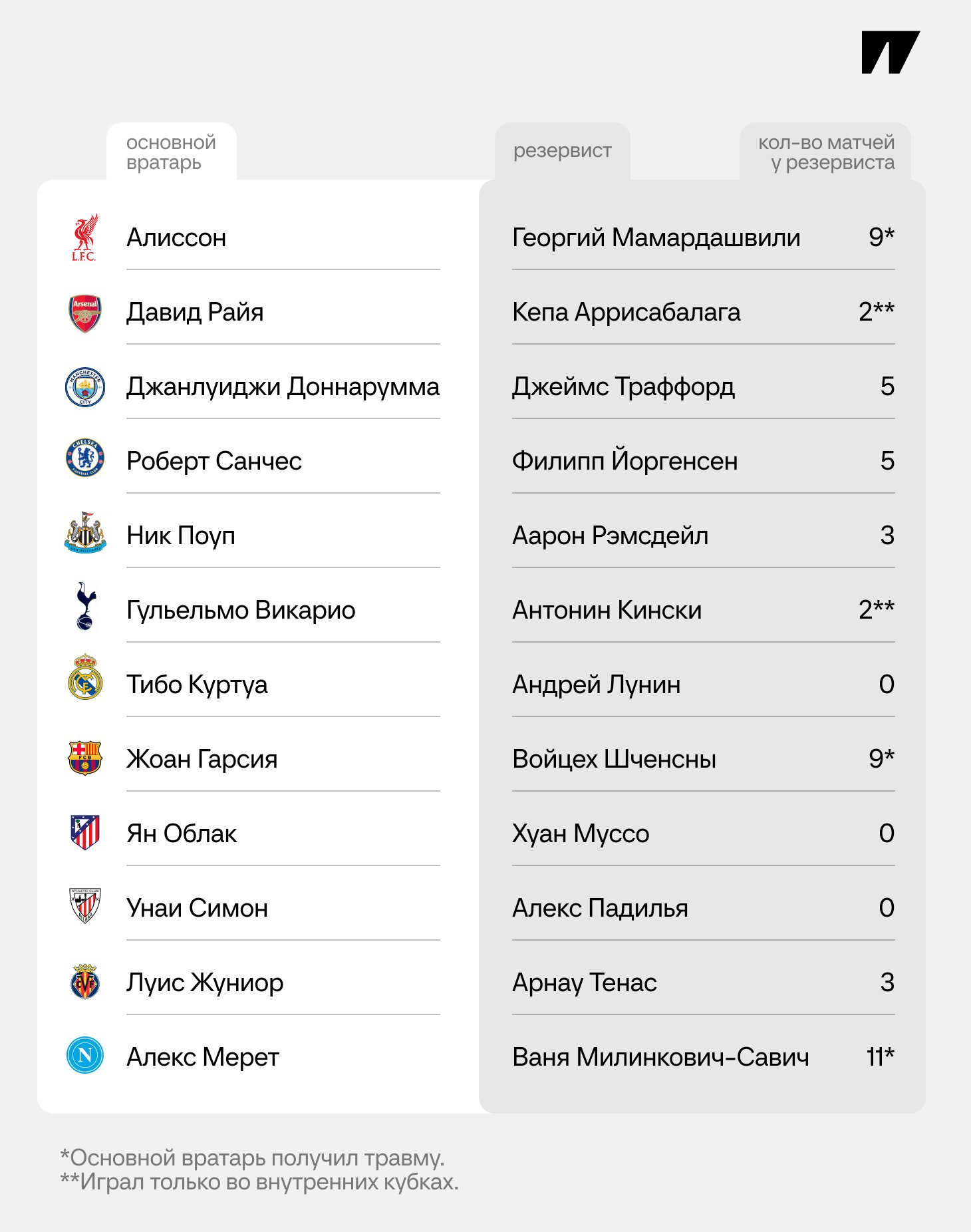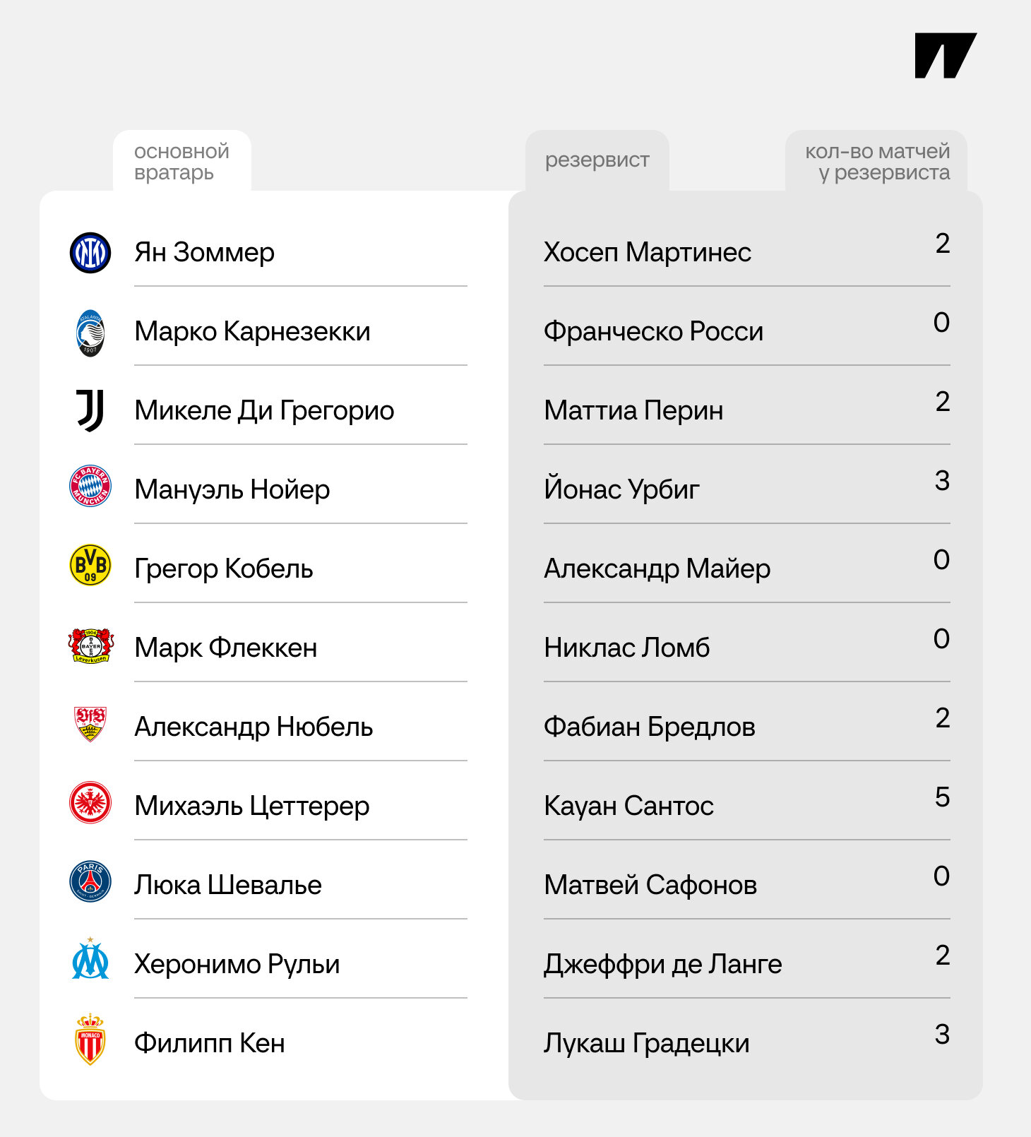 При этом 0 игр для резервного голкипера в топ-клубе – совсем не аномалия. Проанализировали ситуацию у участников Лиги чемпионов из топ-5.