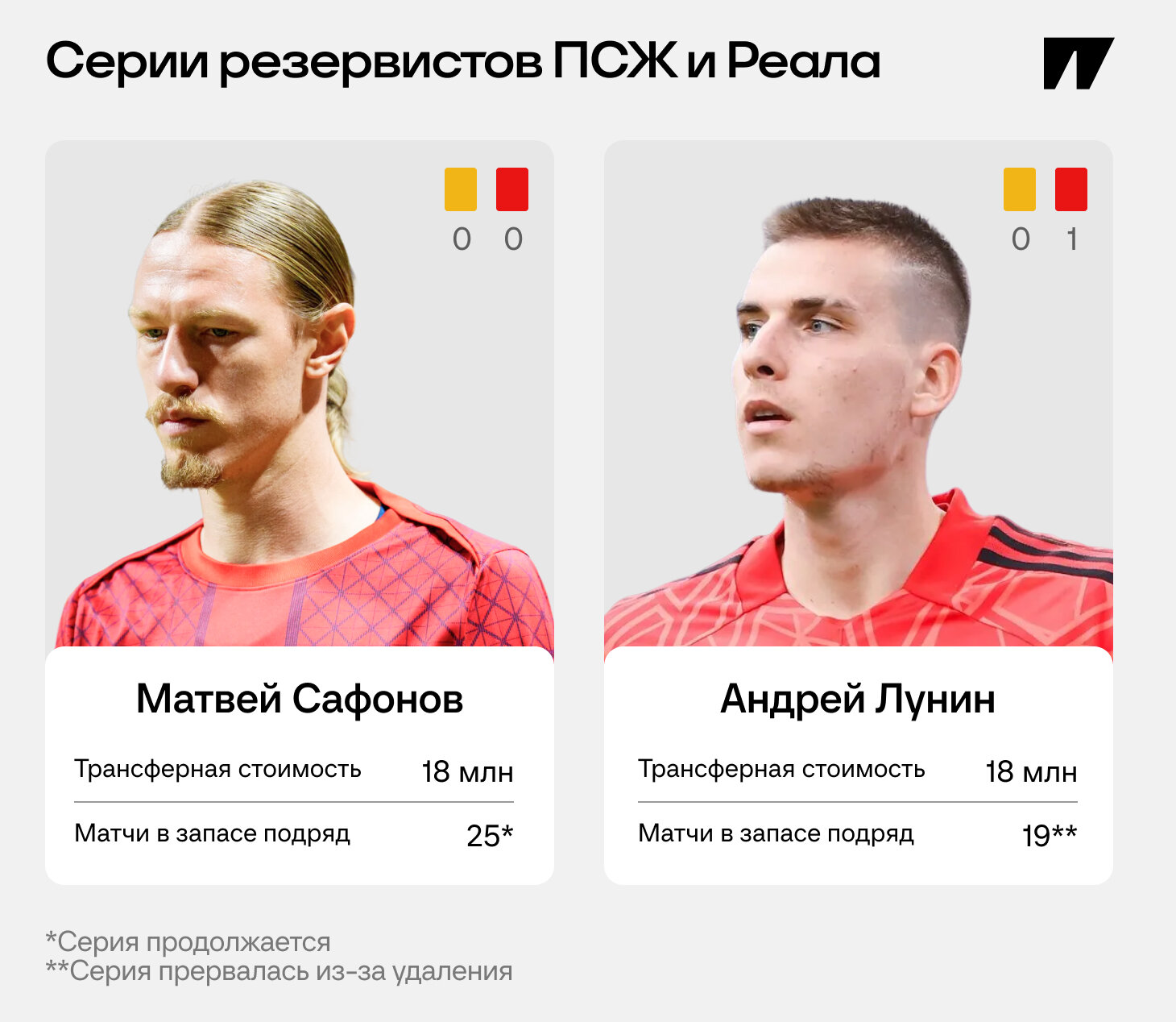 Безусловно, среди всех резервистов топ-клубов выделяются именно Матвей Сафонов и Андрей Лунин. Только в «Реале» и «ПСЖ» настолько дорогие вторые номера вообще без игровой практики.