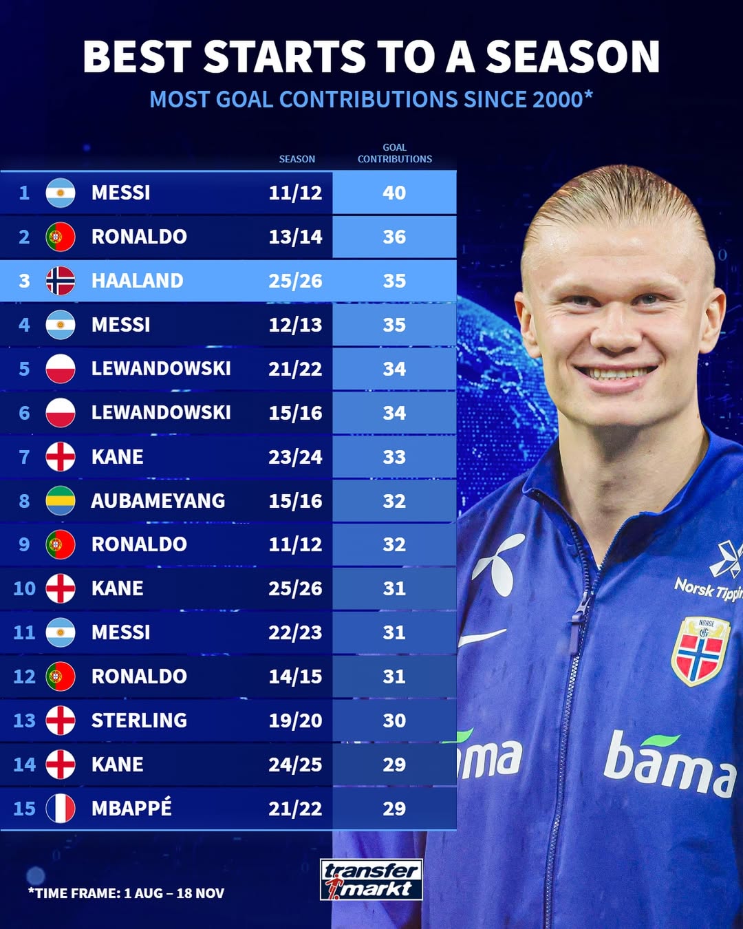 Холанд выдал один из лучших стартов сезона в XXI веке. Впереди только Месси и Роналду