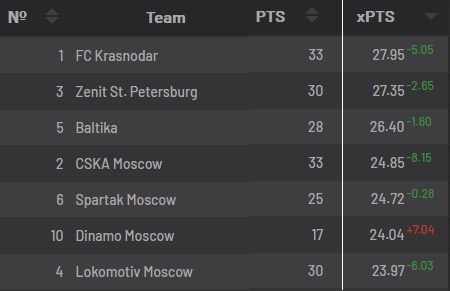 И, казалось бы, с такой отвратительной обороной и большими проблемами в атаке динамо, по ожидаемым очкам должны сильно уступать лидерам, но на деле совершенно не так.
