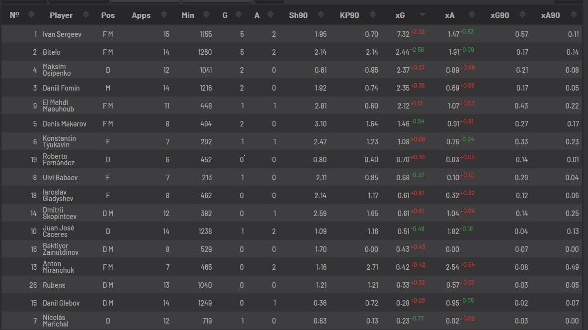 Тут мы можем вспомнить досадные промахи Ивана Сергеева с убойных позиций, когда форвард Динамо должен был записывать на свой счет голевое действие. Отсюда отрицательная статистика по ожидаемым голам. Но не стоит говорить только про Сергеева. Практически все игроки основного состава Динамо имеют отрицательную статистику по ожидаемым голам. Из всех игроков выделяется Бителло, который забил больше, чем ожидалось, но это исключение. А как говорится исключение подтверждает существование правила. К сожалению, Иван Сергеев пока не оправдывает вложенные деньги в его трансфер, а Тюкавин не набрал нужных кондиций после травмы крестообразных связок. Большое количество травмированных фланговых вингеров (Гладышев, Артур Гомес, Макаров) и травма, набравшего ход Миранчука, не позволили Динамо рассчитывать на большее в атаке.