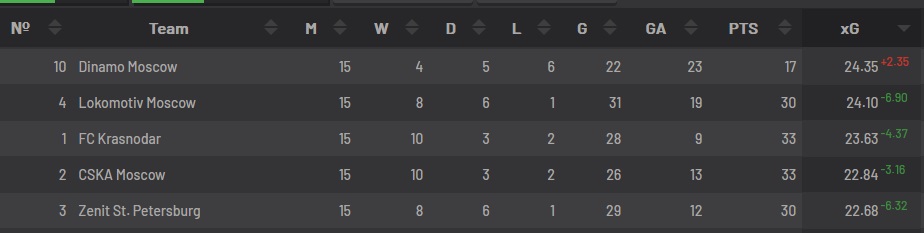 По ожидаемым очкам Динамо должно занимать 6 место, опережать Локомотив, который многие хвалили и по делу, и отставать от лидера чемпионата Краснодара на 4 очка (а от ЦСКА и вовсе на очко)! Армейцы вырывают на зубах такие матчи, с Динамо Мх, А Динамовцы теряют очки в матче с Тольятинским Акроном, который выиграли по xg.