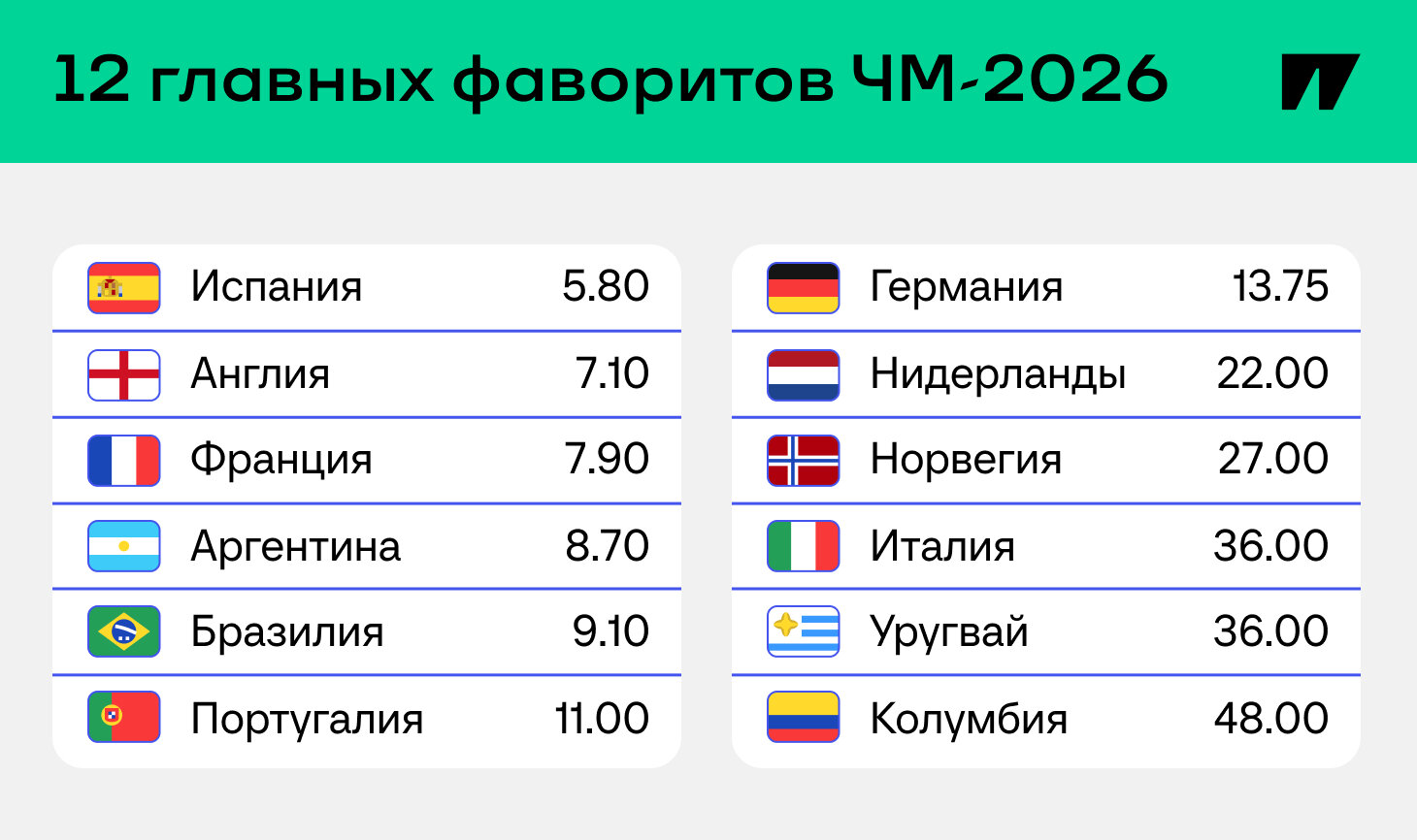 Вот так букмекеры оценивают шансы на победу на ЧМ-2026 на данный момент.