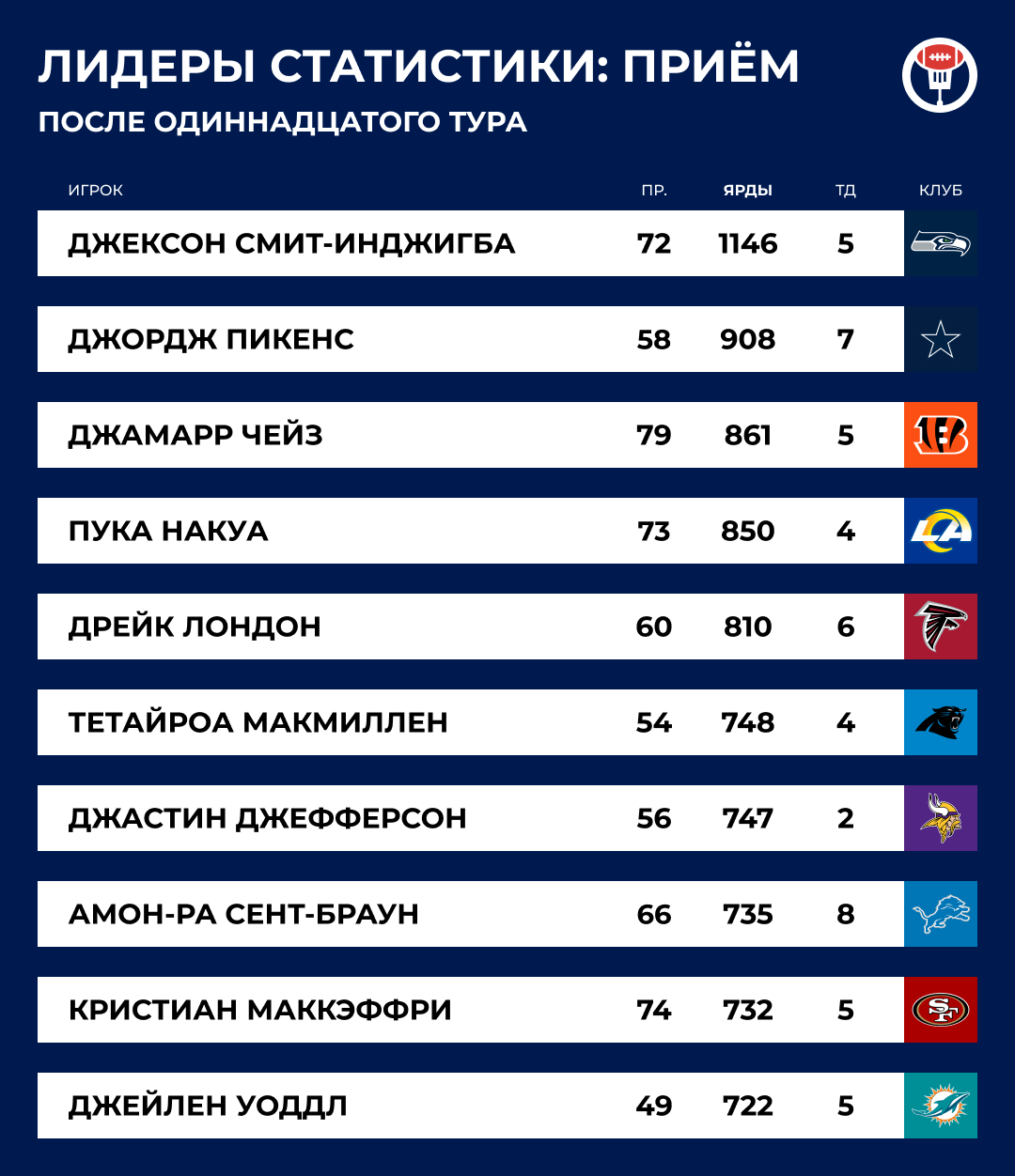 Уже очень скоро к элитной компании должен присоединиться Деандре Хопкинс (997) и, возможно, Стефон Диггс (916).