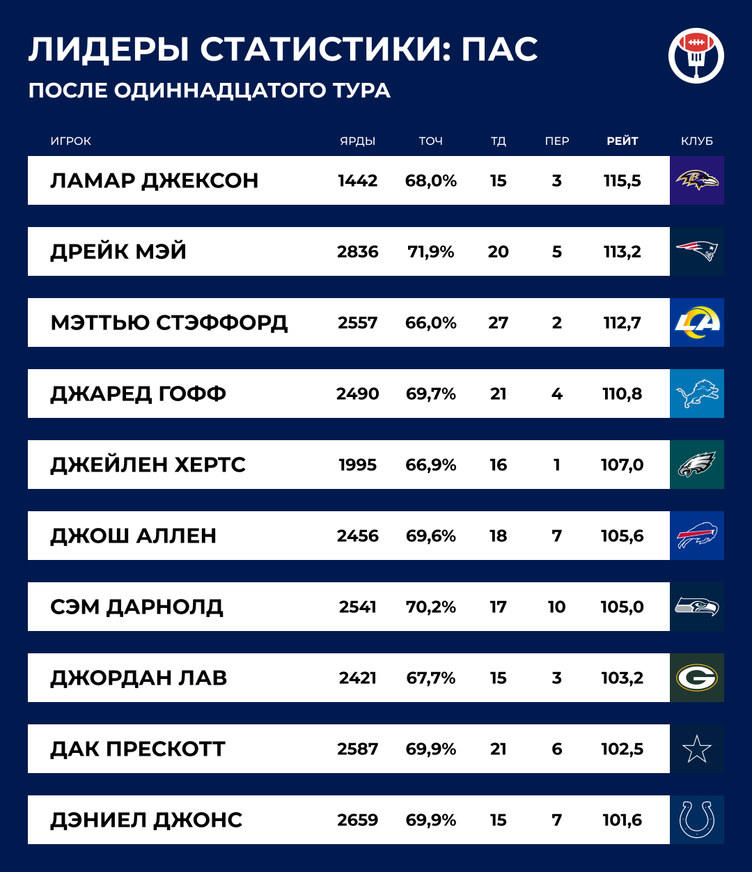 Раз уж зашла речь про элитных квотербеков, посмотрите, кто у нас в этом туре установил впечатляющие рекорды.