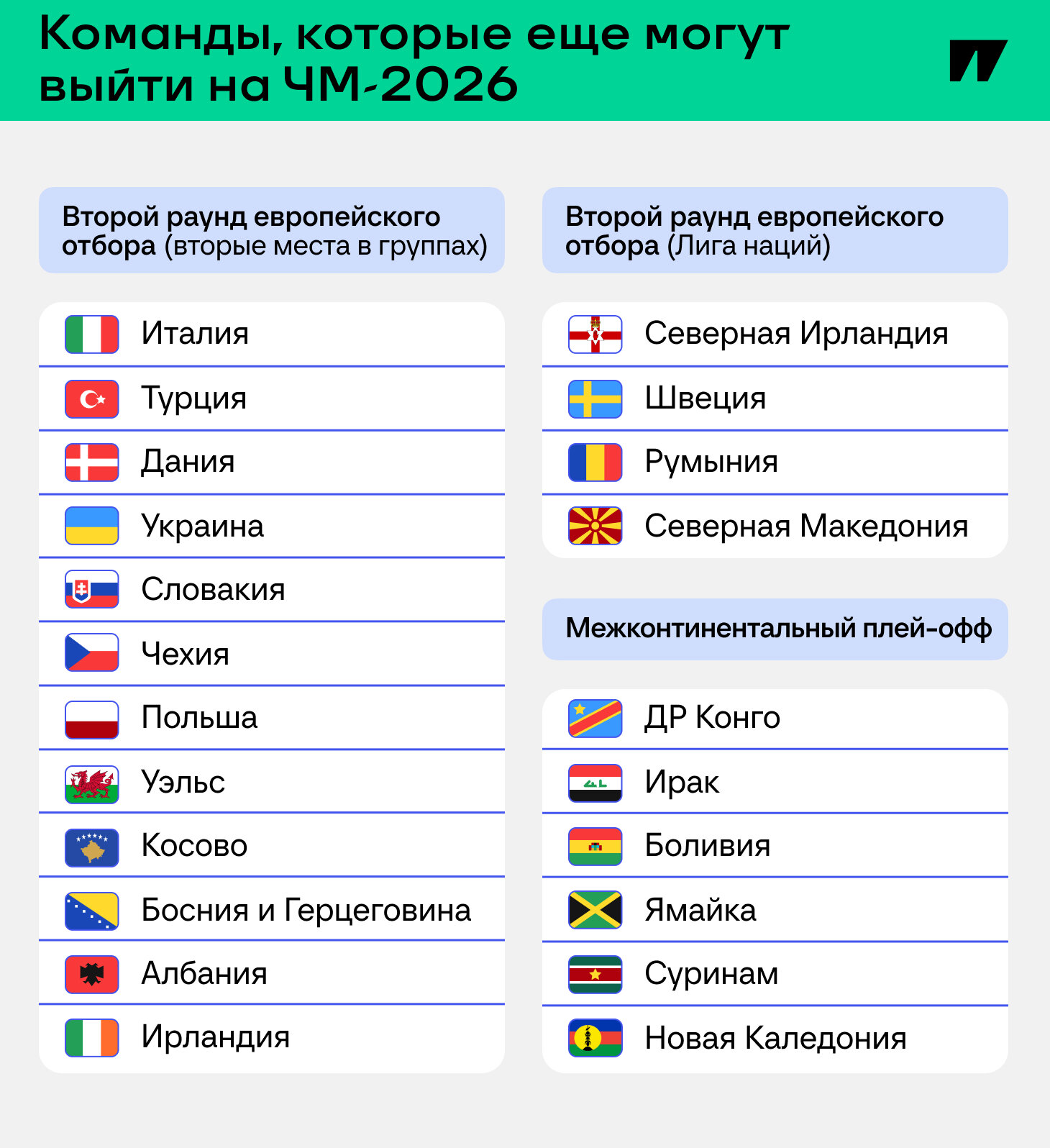 И второй раунд европейского отбора, и межконтинентальные стыки пройдут уже в марте 2026-го – к апрелю узнаем всех участников ЧМ.