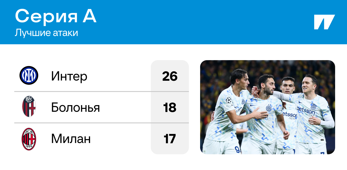 «Интер» – единственный в лиге, кто забивает во всех матчах. И практически всегда минимум дважды – только в трех играх было по одному мячу. «Болонья», например, в трех матчах ушла без забитых голов, но в семи было 2+. У «Милана» пять игр с двумя мячами, только одна – с тремя.